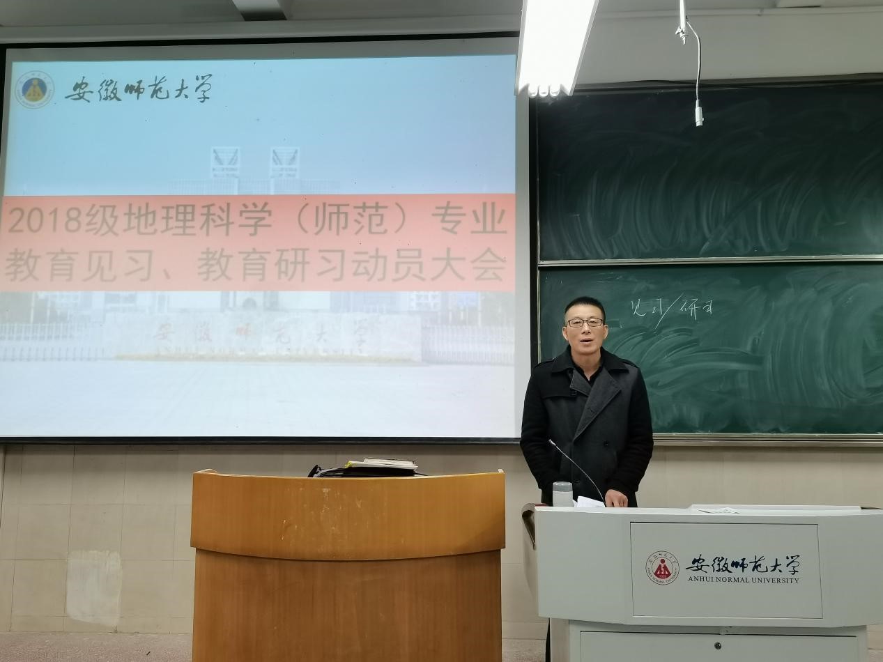 为加深对专业知识的理解,增强综合运用专业知识的能力,高质量地完成专业见习、研习活动,11月27号下午2点,2018级地理科学师范班于教学楼2号楼102教室举行师范专业教育见习、研习动员大会。此次会议由指导老师朱永恒主持,2018级地理科学师范专业全体成员参加。