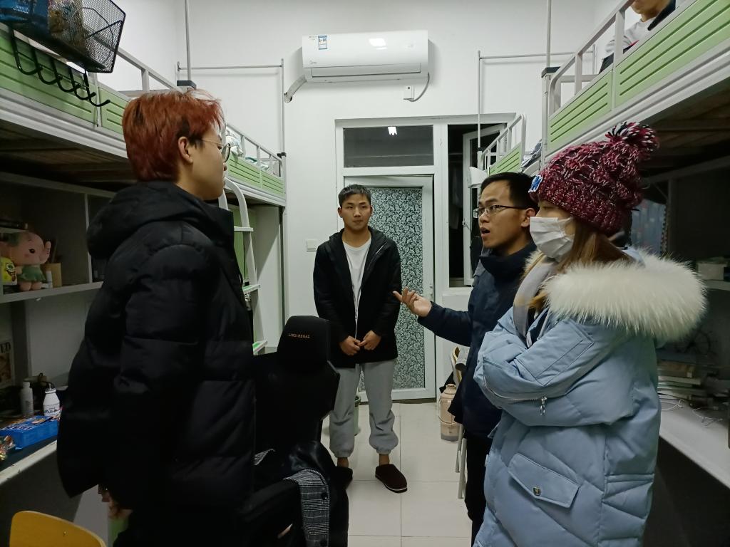本次寝室走访,旨在突击排查学生晚归不归和寝室安全用电和防火防盗等安全隐患,教育学生高度重视安全健康,严格执行学校安全管理相关规定,不能抱有任何侥幸心理。检查过程中,乔静书记与同学们深入交流,反复叮嘱同学们,冬季要高度关注用电防火安全、饮食安全、出行安全、财务安全、就业安全等工作,加强体质锻炼,提高健康意识,增强抵抗力。在走访寝室过程中,辅导员老师们也认真了解排查了校园贷、套路贷、违规电器、私拉电线接线板等违规行为以及预防校园宗教非法渗透等情况,提醒同学们要高度重视安全工作,提高安全意识,同时提醒研究生招生考试及期末考试在即,同学们要合理安排作息时间,加强营养,放松心态,积极备考。此次突击检查,反馈结果良好,同学们基本都能自觉遵守“四项禁令”相关要求,认真执行“晚点名”制度,同时对寝室存在的安全隐患进行了及时纠正和提醒。