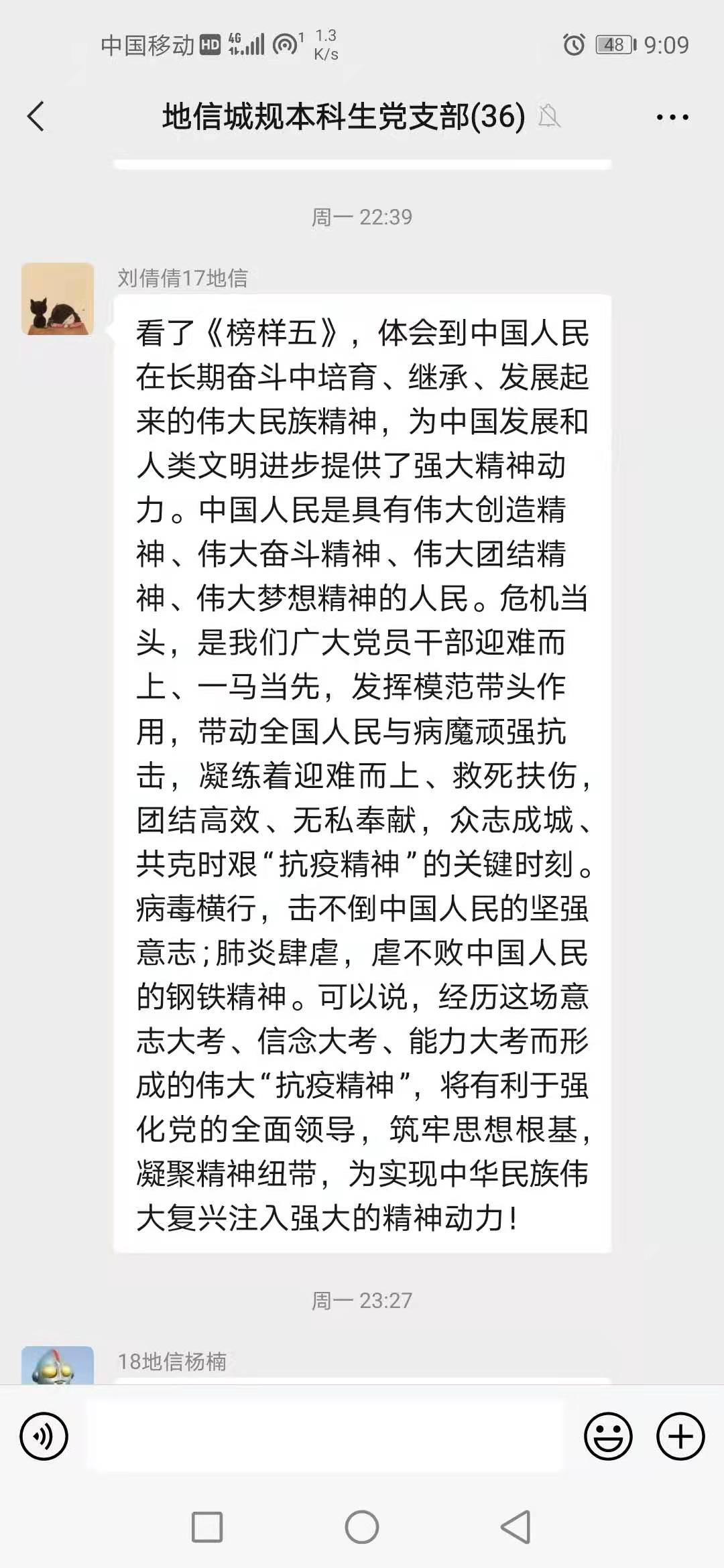 地信城规本科生党支部全体成员于3月22日观看《榜样5》专题节目,并纷纷发表自己的观后感,17地信李正妍同学写道:“我观看了《榜样5》节目,学习了2020年新冠肺炎疫情肆虐时期,不畏困难、一心为民的优秀共产党员积极抗疫的先进事迹。看完之后我感到十分震撼,也十分感动。在抗疫大战中,全国各族人民团结一心,党员干部坚守岗位、在线冲锋,广大民众英勇战斗、众志成城。面对肆虐不定的新冠病毒,各党员组织他们坚定不移,积极投身疫情防控工作,不忘初心、牢记使命、敢于斗争敢于胜利,彰显了基层党组织战斗堡垒作用和党员先锋模范作用,诠释了生命至上、举国同心、舍生忘死、尊重科学、命运与共的伟大抗疫精神,向伟大的抗疫英雄致敬!‘这世上没有从天而降的英雄,只有挺身而出的凡人’。榜样的力量是无限的,我们要向榜样学习。作为党员,通过对"抗疫精神”的学习我明白了党员要在关键时刻冲锋在前。我们要时刻牢记入党的初心和为人民服务的宗旨,把人民的利益放在第一位。我们应当具有新时代的责任和担当,始终团结在党中央的领导下,踏实努力,为未来可能面对的风雨挑战积蓄力量,为祖国的伟大复兴努力奋斗。”