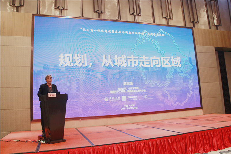 吴志强在题为“智慧城市,智能治理”的报告中指出长三角一体化本阶段的关键词是更高质量,必须在长三角原有的基础设施一体化基础上,提升为科创的一体化、社会治理的一体化和生态文明建设的一体化。郭仁忠作了题为“国土空间治理的理论与技术创新问题”的主旨报告,指出了国土空间格局的现状和治理路径,从认知和工程技术两个维度给出国土空间治理需要解决的科学技术问题,最后提出了下一步研究的框架和方向。黄贤金教授在题为“碳中和与国土空间格局优化”的主旨报告中,从国土空间冲突的角度,详细阐述了碳中和与国土空间优化之间的内在逻辑和机理联系,并提出了基于碳中和的国土空间优化建议。