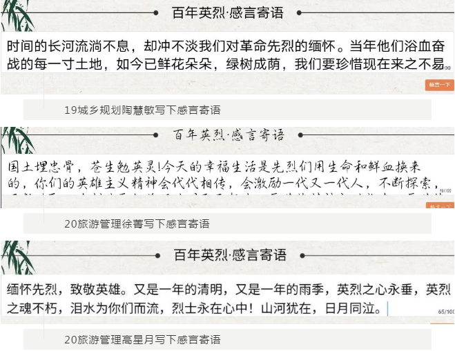 站在“两个一百年”奋斗目标的历史交汇点上,全体地旅师生尊崇英雄、缅怀英烈,在革命先烈精神的感召下,传承红色基因,赓续优良传统,激发爱国热情,自觉在党史学习教育中汲取奋进力量,砥砺前行。