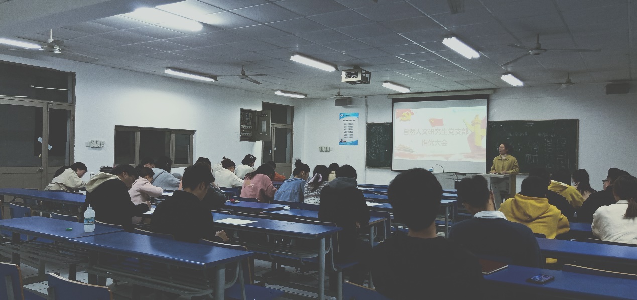 胡艳红)为了为党组织纳入新鲜血液,培养后备力量,4月9日晚上,自然人文研究生党支部在实验楼203召开了拟发展对象推优大会。参加本次大会的有20名正式党员、2名预备党员、各年级班委及群众代表。会议由党支部书记曹雨同志主持。