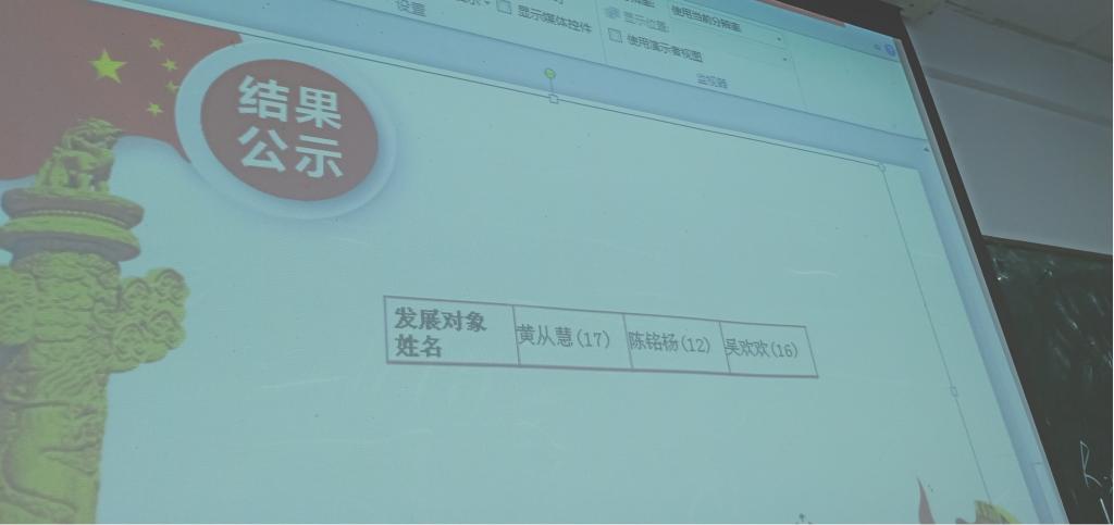 入党的基本流程和发展对象的评价标准,公布发展对象名额,公布本次推优大会的候选名单。本次大会的候选人员有金院、黄从慧、吴倩倩等8名候选人,总共选举3名发展对象。表示本次投票为无记名投票,表明整个投票过程将会公平公正公开,每人可以选择3位入党积极分子进行投票,超过3人视为废票。其次是入党积极分子进行自我汇报,八位候选人分别就其参加的集体活动,为群众服务工作等内容进行汇报,结合自身的实际情况表达了自己对加入中国共产党的决心和强烈愿望。同时参会的正式党员结合候选人现场情况对候选人进行投票。最后现场统计公布各位候选人的票决情况,对票决结果进行公示。最后,根据最终结果,拟推荐黄从慧、吴倩倩、陈铭杨为本期发展对象。