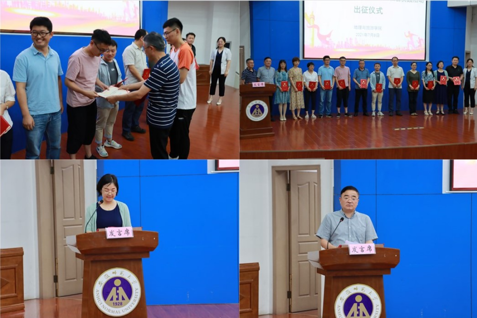 2021年大学生暑期“三下乡”社会实践活动出征暨授旗仪式在敬文图书馆学术报告厅举行。校团委副书记张薇薇,暑期社会实践思政指导教师孙艳秋,院党委书记贾冠忠,院长苏勤,院教授委员会主任程久苗,院党委副书记乔静,副院长方凤满,副院长曹卫东,副院长汪文文,院暑期社会实践团队指导老师代表王群、方叶兵、徐玉婷、王雪微、韩会然、张伟、王莉、姜伟、朱爱萍、朱晓强,以及全体专兼职辅导员、全体暑期社会实践团队队员参加了出征仪式。仪式由院团委书记陈祥云主持。