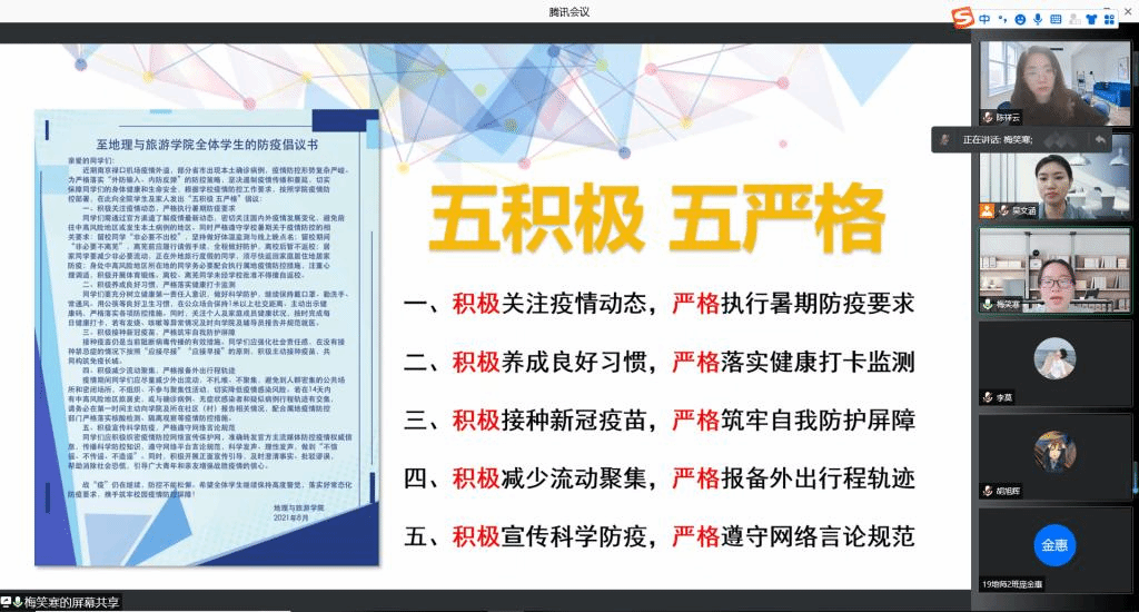 2019级地理科学拔尖人才班丁梦瑶同学以“科学防疫 从我做起”为主题为大家介绍了科学防疫小常识及学校关于疫情防控的相关要求,并根据2021年联防联控机制发布的新版“戴口罩指引”为同学们现场示范正确有效的口罩佩戴方式,提醒团员青年养成良好生活习惯,充实暑期生活,关注心理健康。