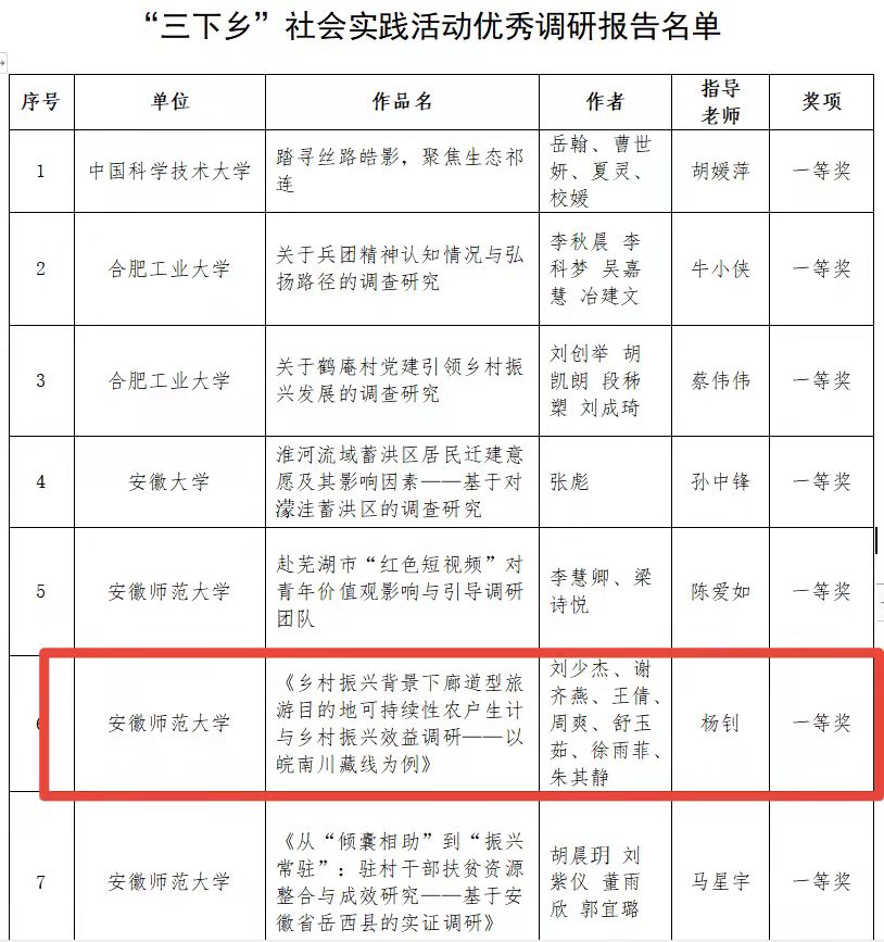 省级优秀调研报告一等奖为《乡村振兴背景下廊道型旅游目的地可持续性农户生计与乡村振兴效益调研——以皖南川藏线为例》,指导教师为国产精品