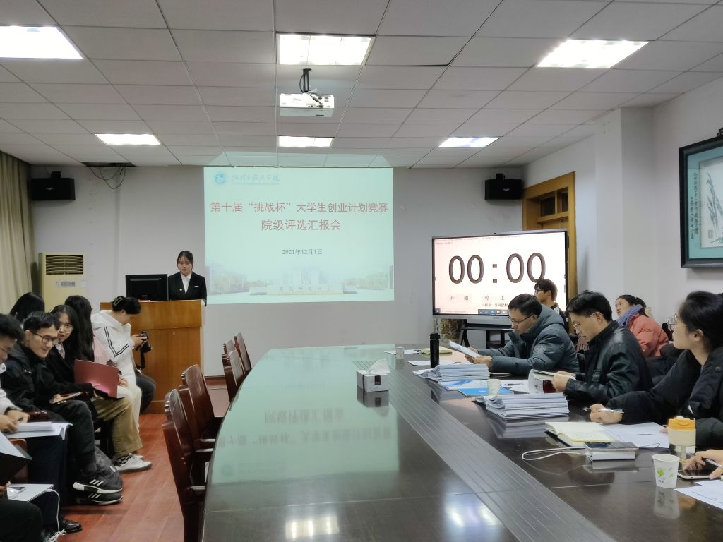在院三楼会议室举办第十届“挑战杯”大学生创业计划竞赛院级评选汇报会,安徽行为科学学会、安徽省管理学会理事经管学院副教授朱立冬和中国人力资源开发研究会智能分会理事、经管学院副教授何建华担任评委,会议由韩红豆主持,学院团委书记陈祥云、辅导员韦银艳、吴文涵参会。