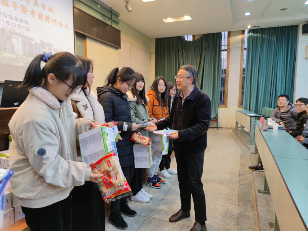 最后,学院领导、专业负责人、教师代表为考研学子分发牛奶、零食、考研文具袋等慰问品,并留影纪念。学生们纷纷表示感谢领导、老师的关心慰问,一定会全力以赴,奋战到底,不辜负自己的努力和学院的期待。