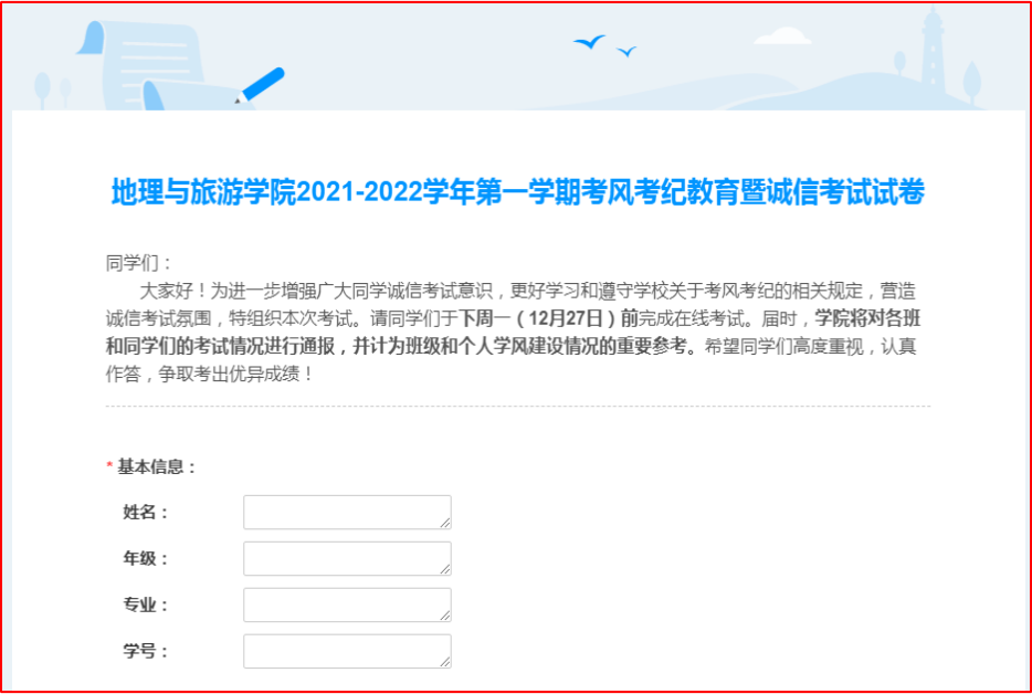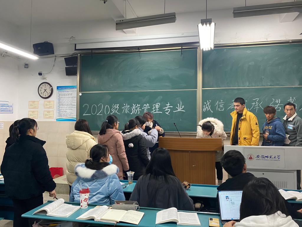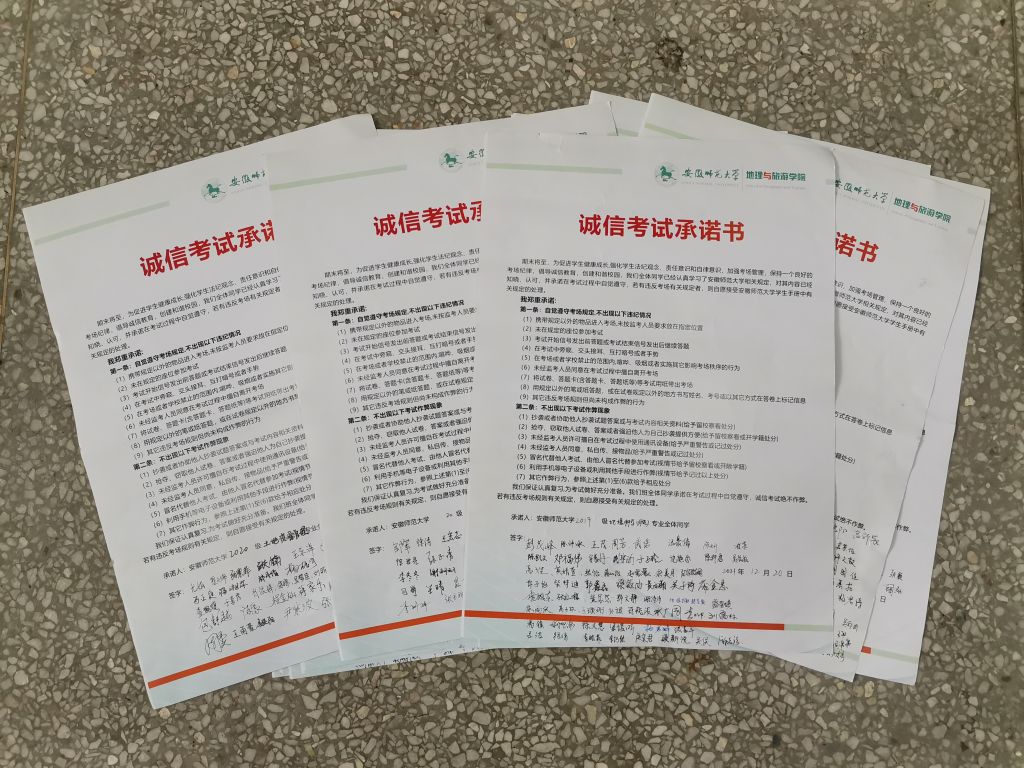 承诺诚信考试,规范学生诚信考试纪律。进一步实现“零作弊、零违纪”的目标,学院各班级在传达学校、学院诚信考试文件精神的基础上,所有学生认真阅读了诚信考试承诺书,对个人、班级、学院、学校作出承诺,践行诚信考试承诺,自觉遵守考场规定,杜绝违规违纪行为的发生。