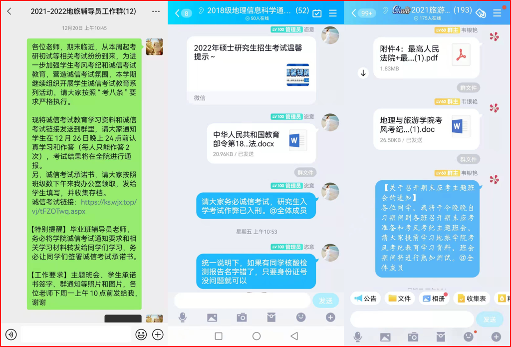 进行在线宣传,营造学生诚信考试氛围。进一步推进学生考风考纪教育,学院召开期末学生考试诚信教育专题会议进行布置,要求各年级专业辅导员通过QQ、微信等网络新媒体,开展线上专题教育,切实把考风考纪工作抓在手上、落到实处,有效提高了同学们的思想认识,端正了考试态度,营造了诚信考试、诚实做人的氛围。