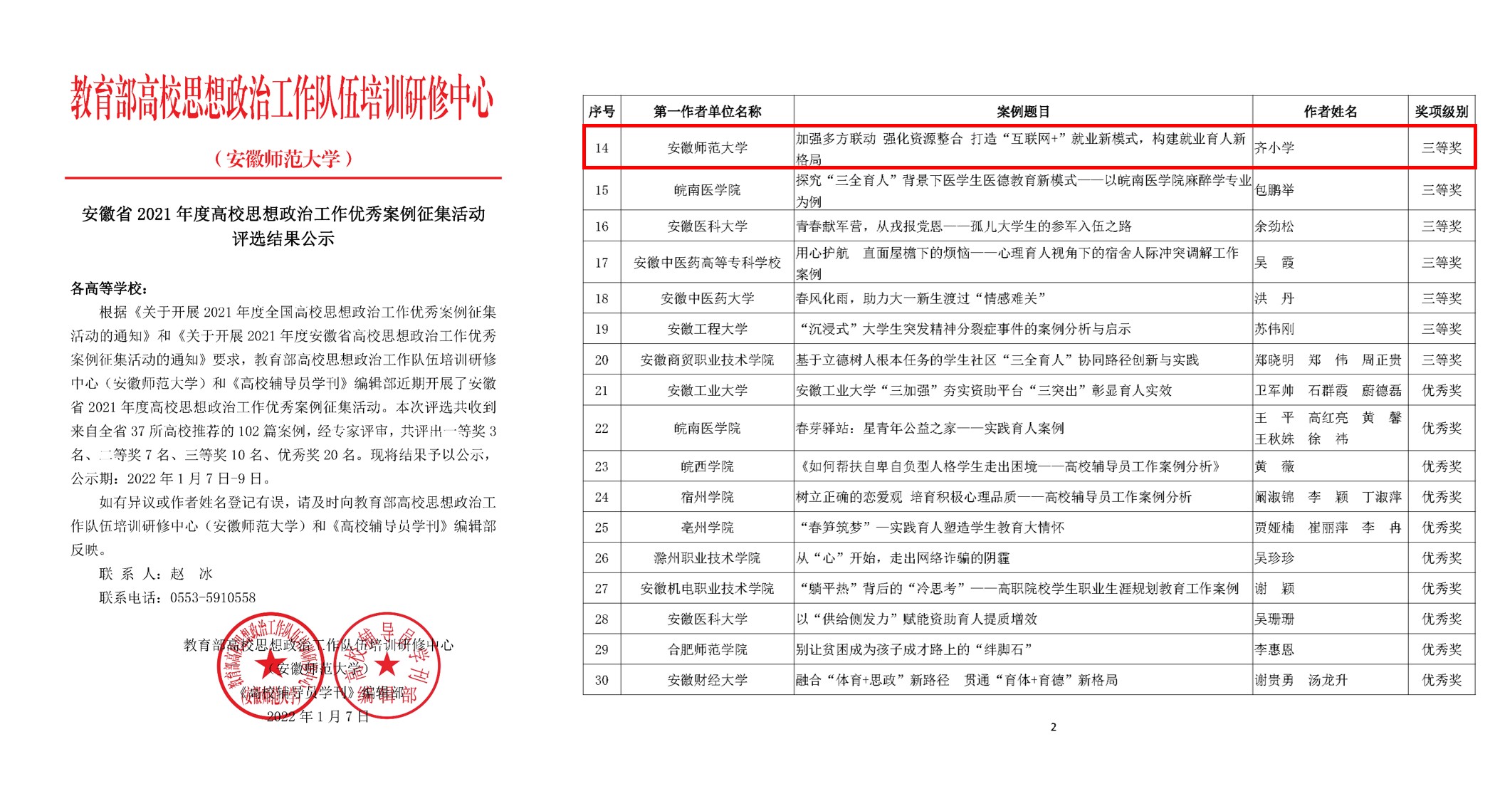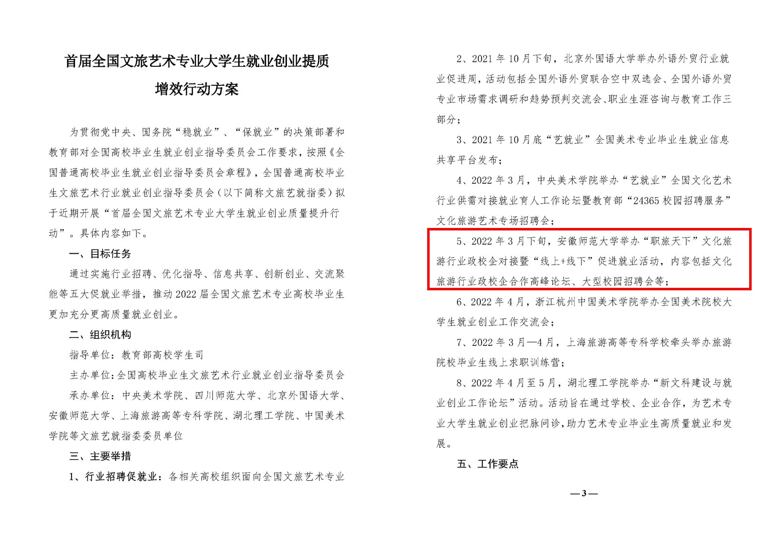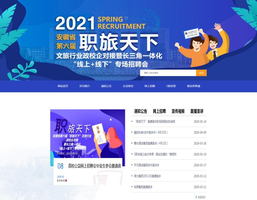 打造的就业品牌——“职旅天下”安徽省旅游行业政校企在线对接活动暨高校公益网上招聘已成功入选教育部高校学生司指导、全国高校毕业生文旅艺术行业就业创业指导委员会主办的首届全国文旅艺术专业大学生就业创业提升行动(全国仅8个),并荣获安徽省2021年度高校思想政治工作优秀案例,服务了学校毕业生就业工作,发挥了就业育人的重要作用。