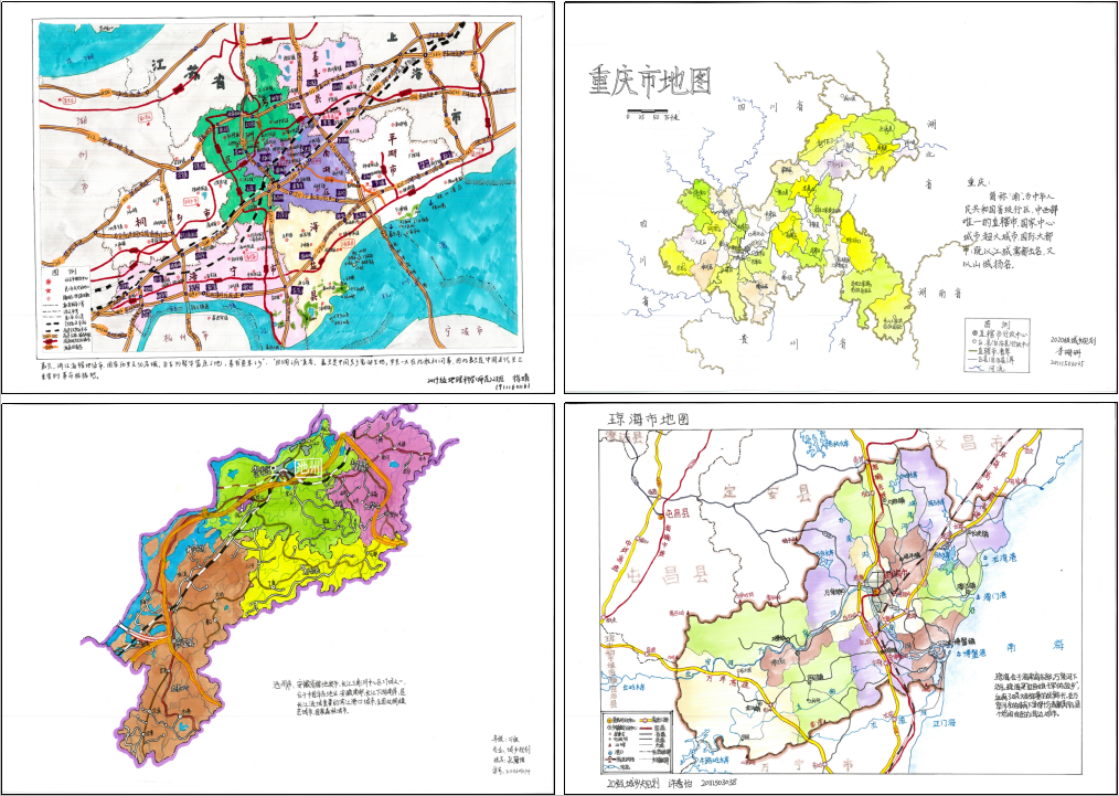 地理科学、城乡规划、地理信息科学、旅游管理等各专业学生的积极响应,同学们踊跃报名参与,并认真完成了一幅幅手绘地图作品。据统计,活动共征集作品266幅,涵盖北京、安徽、湖北、西藏、台湾、香港在内的28个省、自治区、直辖市,以及合肥、嘉兴、长沙、桂林在内的105个地级市。