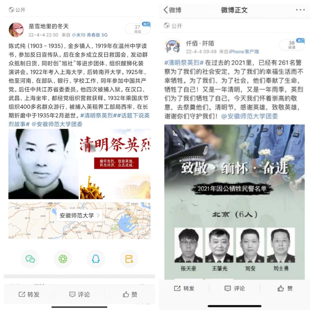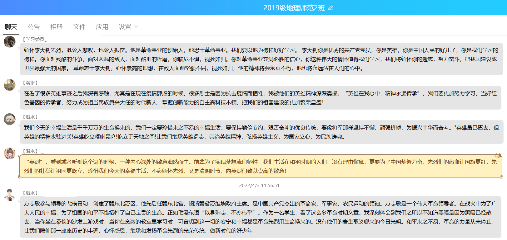 为积极落实疫情防控工作要求,提倡健康文明新风尚,地旅学子们同时通过登录中华英烈网在“致敬.2022清明祭英烈”专区参观网上陵园,瞻仰烈士纪念碑,英烈纪念馆学习英烈事迹。以向先贤先烈鞠躬致敬、敬献鲜花、签名寄语等方式进行网上祭扫,以此表达对革命先烈的崇高敬仰缅怀之情。各班级同时参与“清明祭英烈”话题,通过班级群、个人微博等社交平台分享英烈故事、抒发学习体会,表达个人对革命先烈丰功伟绩的敬仰、深厚的爱国主义情怀以及勇担时代使命的信心和决心。