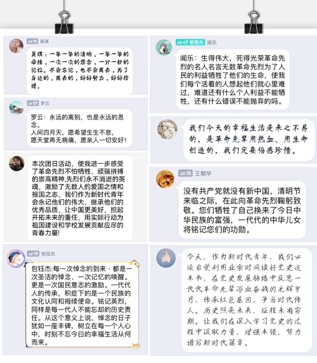 学院各班级围绕“清明祭英烈”和“学习党的青年运动史”两大主题,通过主题班会、草地研讨、湖畔演讲、读书分享等形式积极开展相关活动。通过交流分享英烈可歌可泣的感人事迹,同学们进一步了解了他们光辉和伟大的一生,感受到了他们用生命守护生命、用生命践行使命、用生命书写担当的崇高精神和不惧艰辛、一心为国的革命情怀。
