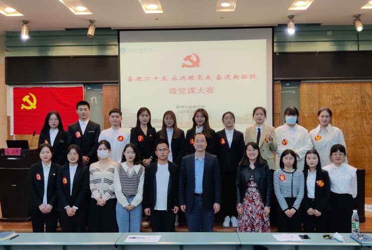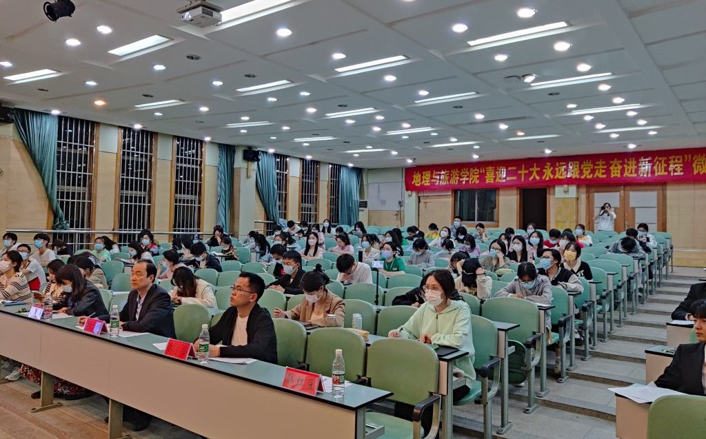 于院实验楼101报告厅举行“喜迎二十大,永远跟党走,奋进新征程”微党课大赛,院党委副书记、纪委书记乔静,院纪副书记王美,地理第一本科生党支部书记齐小学,以及学院专兼职辅导员代表参加活动并担任评委,学院第12期学生党员培训班和第63期入党积极分子培训班学员代表现场观摩学习。