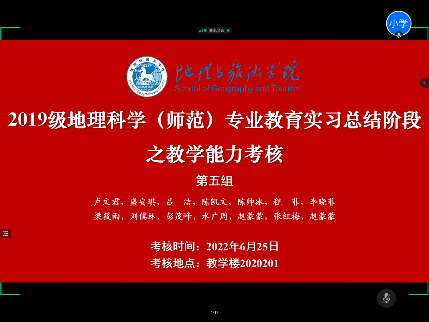 在学校行政楼2号楼一楼、二楼多媒体教室举行教育实习考核,2019级地理科学(师范)专业全本科生以“线上+线下”方式参加考核。考核专门邀请师大附中等重点中学一线教师担任主评委,实行“1位中学地理教师+1位专业教师”双评委制。教育考核由地理科学专业负责人朱永恒主持。