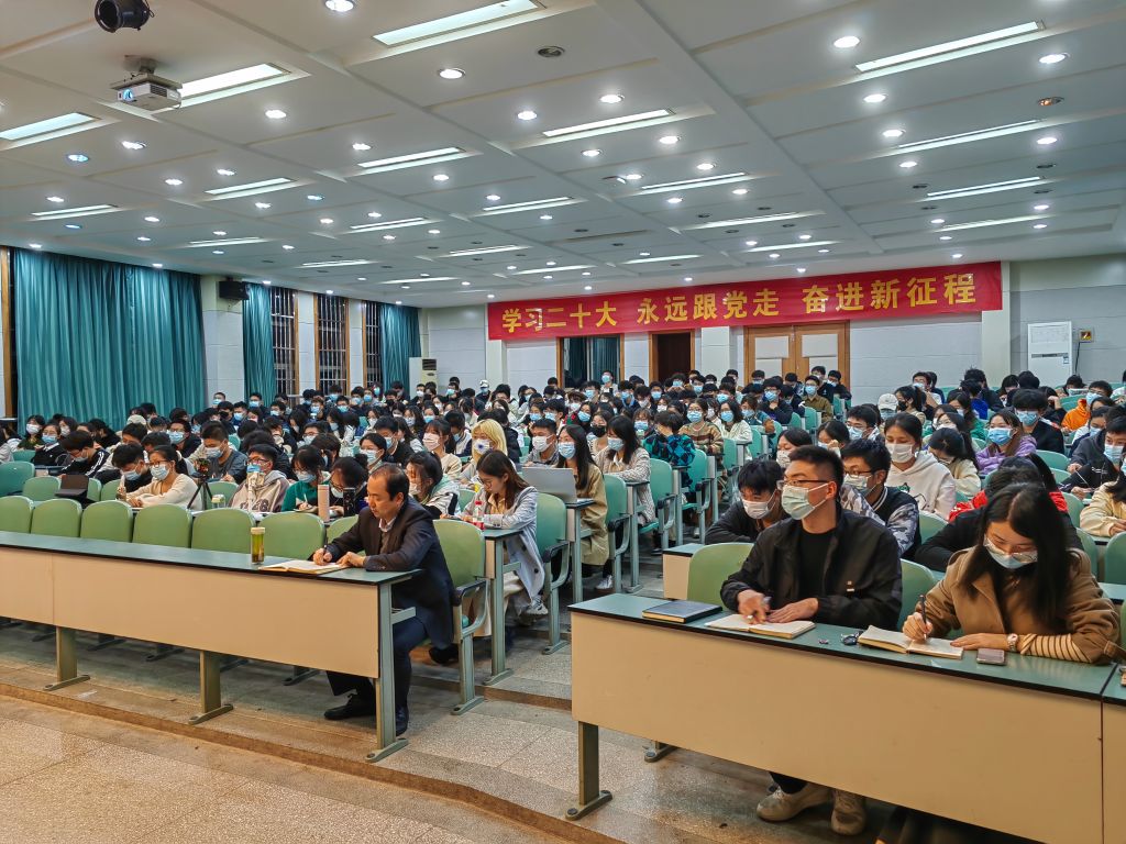 党委副书记乔静、全体专兼职辅导员、各年级各班级学生骨干、寝室长代表等在主会场101报告厅听讲,其他同学通过腾讯会议、现场直播等方式在分会场线上参会。
