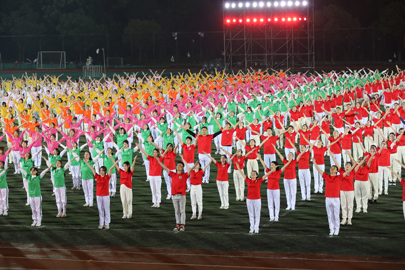 高歌曼舞传扬体育精神。文艺表演环节百花齐放,惊喜不断。舞龙表演威风凛凛,气势磅礴。百余名师生制作80余只非遗鱼灯,舞活一幅鱼灯国画。民族健身舞《梦圆中国》激情四射、《少年中国说》武术表演意气风发、拉丁舞《时代青春》动感十足。在千人齐舞《一起向未来》表演中,国产精品