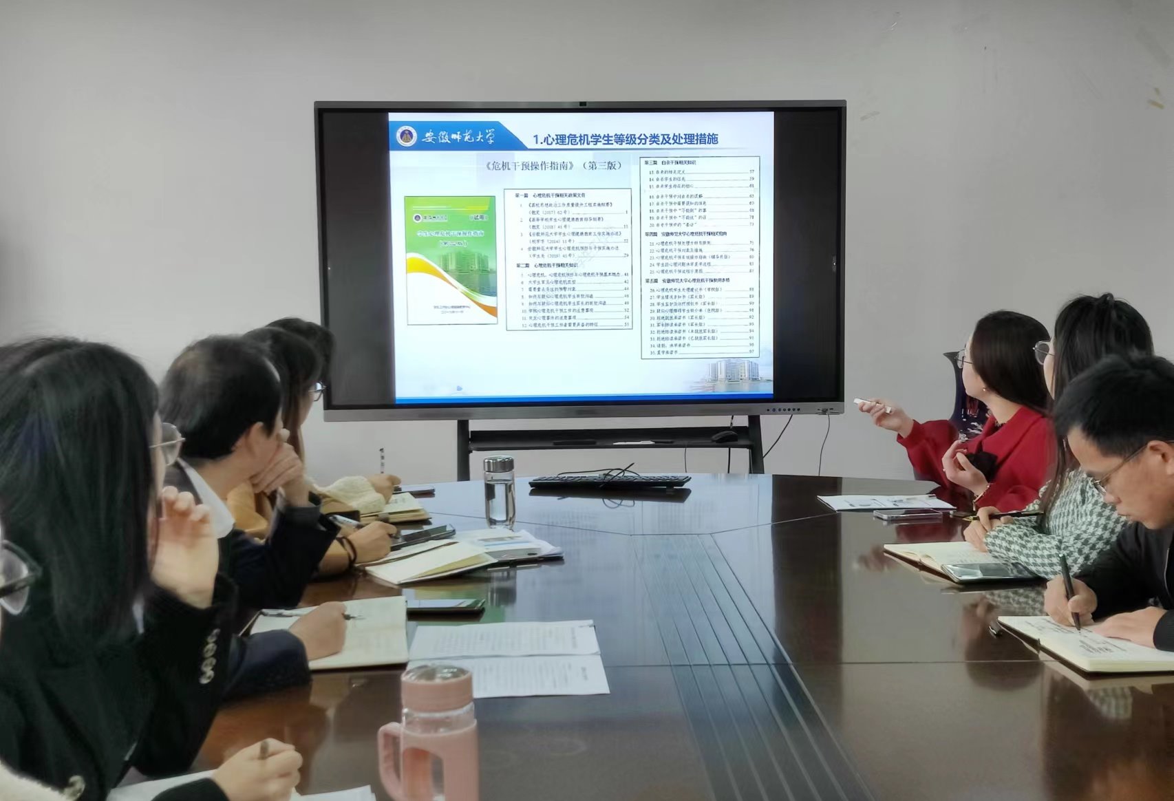 邀请校大学生心理健康教育中心心理咨询师聂余为全体专兼职辅导员做心理危机干预专题培训。会议由学院党委副书记乔静主持,学院全体本科生、研究生专兼职辅导员参会。