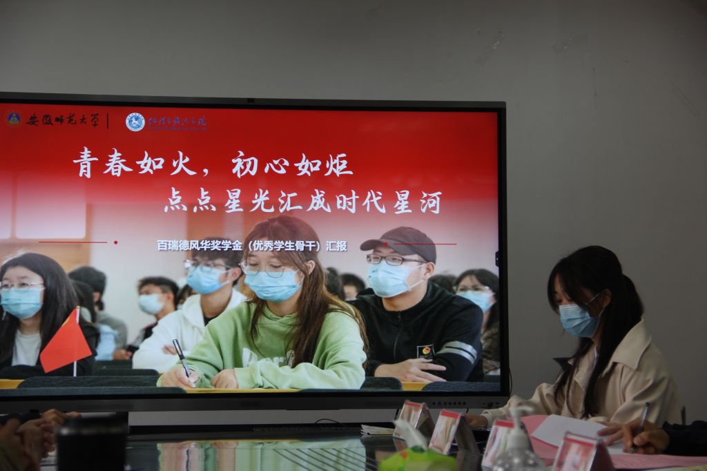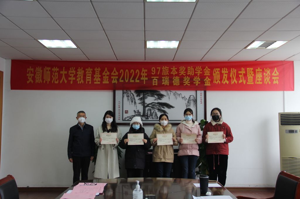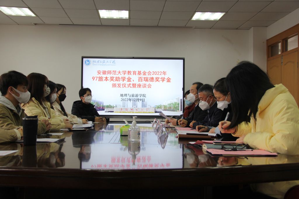 在学院行政楼四楼会议室举行2022年97旅本奖助学金、百瑞德奖学金颁发仪式暨座谈会,院党委书记贾冠忠、院长方凤满、院党委副书记乔静、院团委副书记吴文涵以及各位获奖学生代表出席此次会议,会议由地信地理(非师范)本科生党支部书记、院资助工作负责人彭媛媛主持。