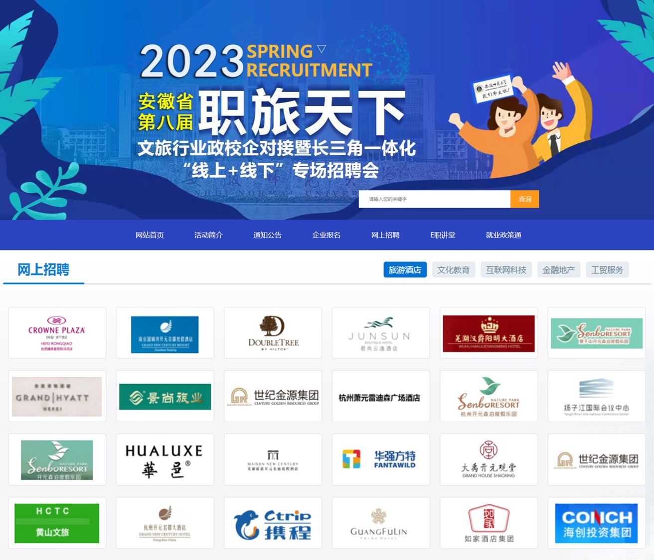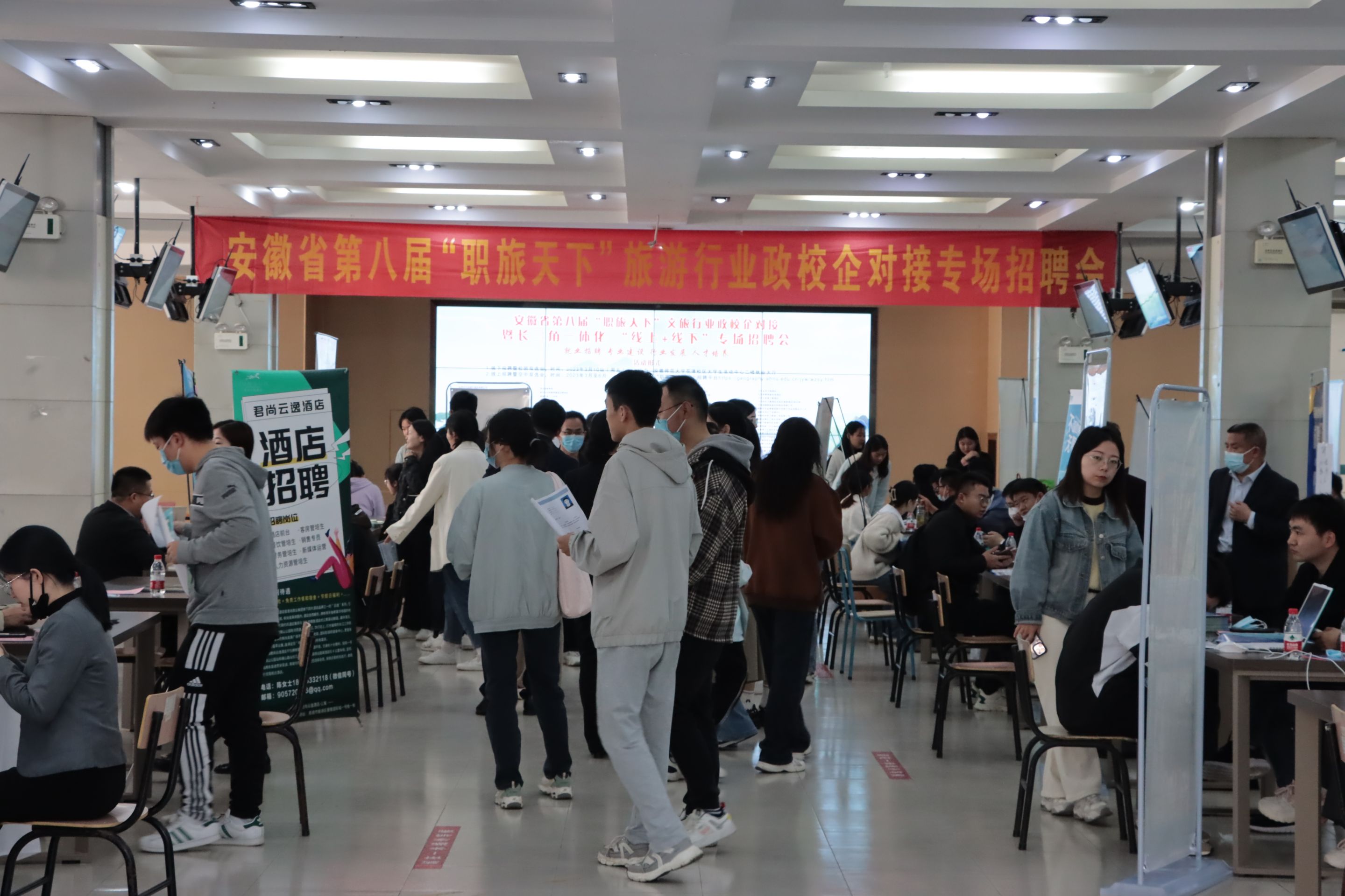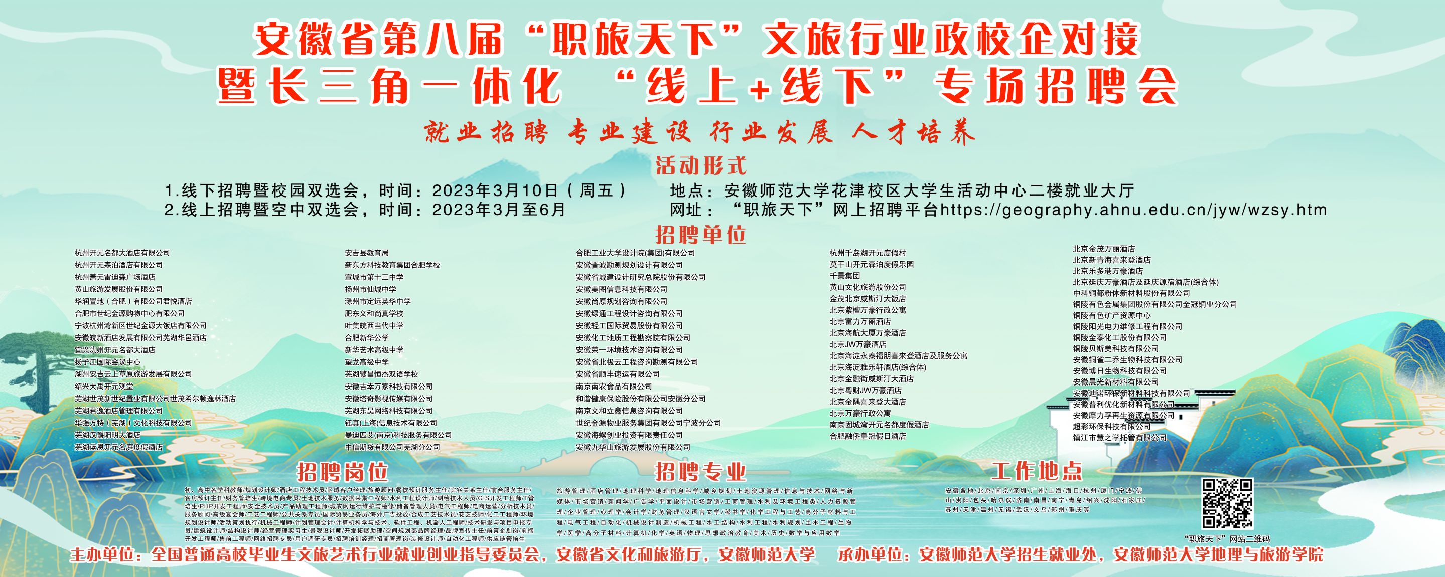承办的安徽省第八届“职旅天下”文旅行业政校企对接暨长三角一体化“线上+线下”专场招聘会在我校成功举办。来自全国各地的近百家企业和铜陵市义安区前来招聘,提供岗位3000多个,涉及文化、旅游、教育、科技等多个门类,涵盖国内外知名酒店集团、景区、地产、规划、咨询、会展、旅行社、教育机构、互联网科技等多个业态,吸引了全校及周边高校毕业生的到来。