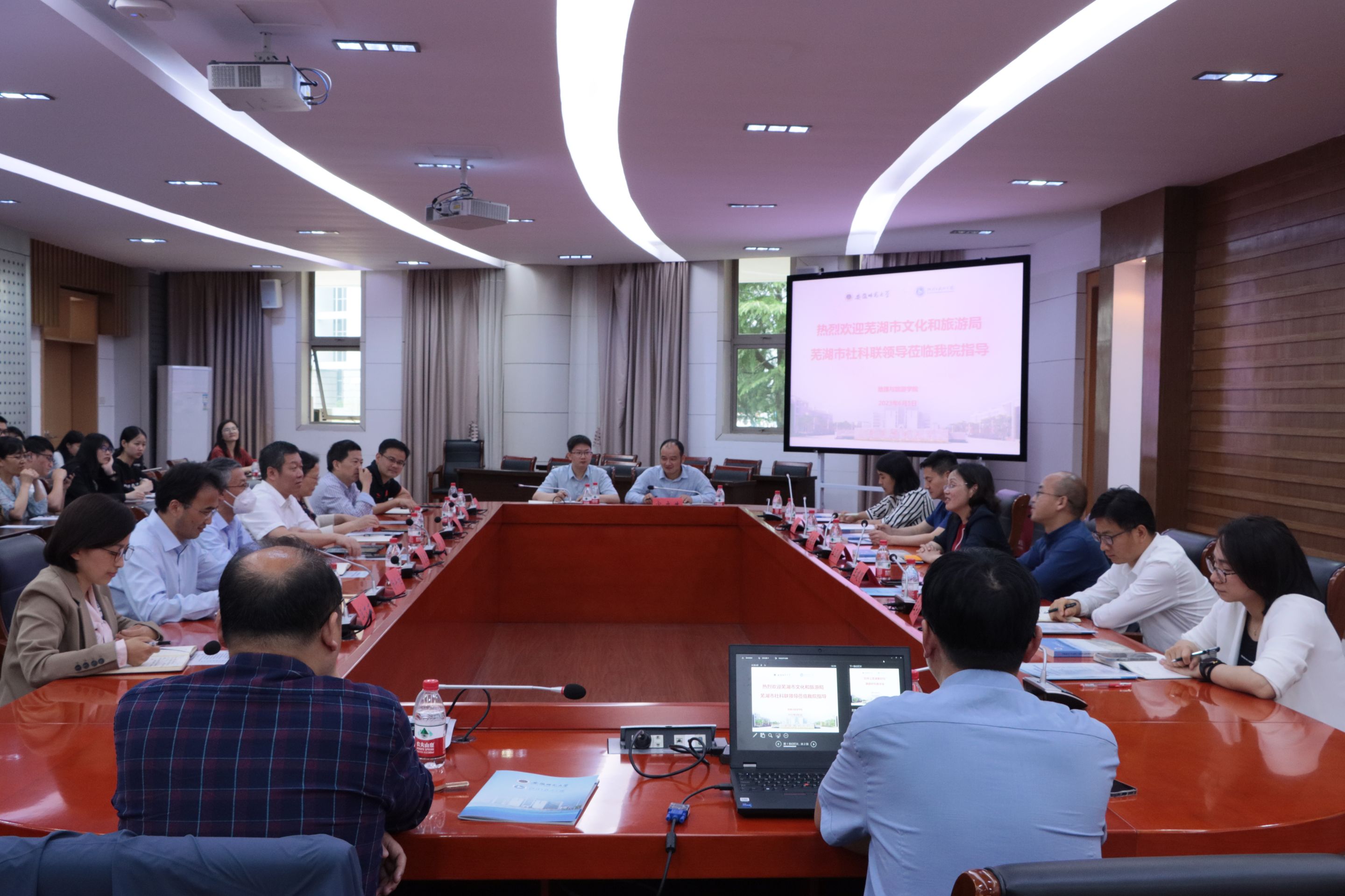 会上,徐彬代表学校对芜湖市文化和旅游局、芜湖市社科联一行的来访表示欢迎,并指出我校作为芜湖市首批“城市合伙人单位”,与芜湖市政府和各职能部门历来有着良好的合作基础,希望我校相关学院能够为芜湖城市的发展贡献力量,通过交流合作实现校地融合,互促共进。