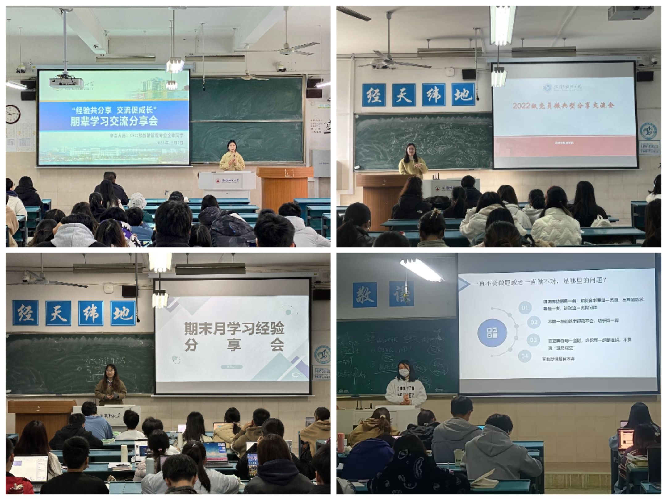 为积极响应“大学生护航”行动计划,帮助青年学生努力实现“一个都不要掉队”的学业目标,学院结合党员先锋“微分享”、“本科生导师制”“导生制”等基本制度和品牌,开展学业护航活动。邀请专业教师针对一些挂科率高、难学难懂的学科,为学生进行期末考试复习规划指导;动员高年级优秀学生典型在晚自习期间或者课后深入一、二年级各班级开展学习经验分享和期末备考交流等主题活动20余场次,覆盖1200余人次。