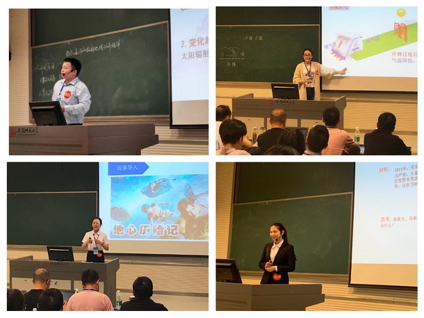 的解维同学,由国庆长假天气预报导入冷锋及其危害,语言幽默生动,极具亲和力;来自宿州学院的袁聪同学以动图、视频、图片等多样化素材,借助自制简易学具生动形象地展示山地形成过程,逻辑严谨,思路清晰;来自皖西学院的潘生娓同学以天灾人祸问题导入,从水资源现状说起,层层递进,剖析人水问题,引人深思……场上的每位选手皆沉着应对,积极表现,整体体现了安徽省高校地理师范生良好的精神面貌、扎实的教学基本功和较高的教学水平。