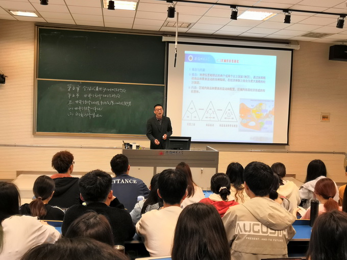 朱永恒教授讲授《世界地理》课程相关内容。校院督导团(组)成员、学院领导班子及部分教师参加本次观摩活动。