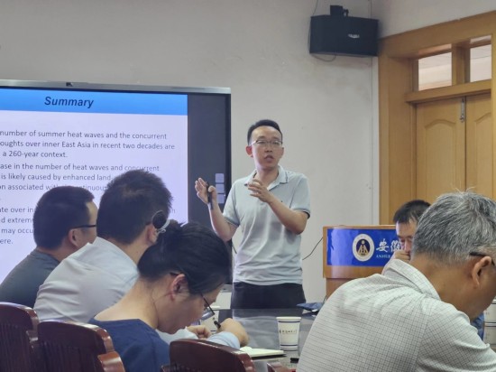 报告会上,张鹏就《Abrupt shift to hotter and drier climate over inner East Asia beyond the tipping point》这篇发表在Science的论文为主题,介绍了团队近年来的工作进展。他以树木年轮数据为基础,对过去260年间的热浪和土壤湿度进行了重建,揭示了东亚内陆地区突然转变为更热更干旱的气候特征。持续性的土壤干燥增强了“陆地—大气”耦合,即陆气耦合效应,加剧了地表变暖和反气旋环流异常,从而加剧了热浪的发生,导致土壤更加干燥。张鹏最后指出,这种“曲棍球棒”式的变化警示人们在东亚气候系统中,变暖和干燥同时发生,且超过了临界点,需要在未来的研究中予以重视。