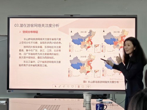 会上,王辉就长山群岛的生态旅游议题进行了详尽的阐述。她从长山群岛丰富的旅游资源及多元化的旅游产品展开,深入剖析了潜在游客的网络关注度,游客客源地的时空分布特征,以及游客行为的具体内容、方式与特征。此外,她还细致调查了渔家乐的特征及游客体验满意度,揭示了这一特色旅游项目的独特韵味与游客的真实反馈。最后,她从三产融合发展、文化保护与传承,以及经济与生态环境协调发展三个方面,提出了长山群岛实现高质量发展的具体路径,为这片海域的未来发展指明了方向。