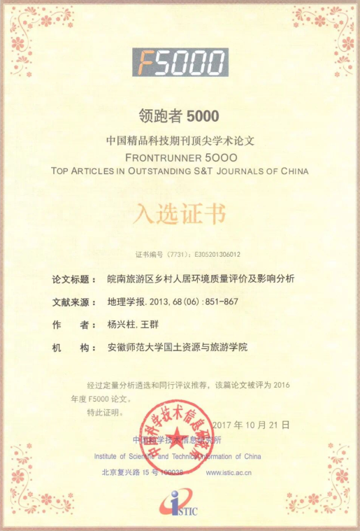 杨兴柱、王群教授的科技论文获此殊荣。入选研究论文《皖南旅游区乡村人居环境质量评价及影响分析》于2013年发表在地理学科一级学报《地理学报》上。