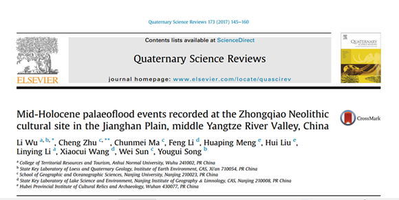 吴立副教授与中国科学院地球环境研究所黄土与第四纪地质国家重点实验室及南京大学区域环境演变研究所等合作开展的中全新世古洪水事件与人类活动响应研究,已取得创新性研究成果。该研究课题通过野外考古调查,利用对江汉平原钟桥遗址疑似古洪水层和研究区现代洪水沉积物的锆石微形态、粒度、磁化率、Rb/Sr等地球化学指标的实验分析和比较,结合AMS14C技术和考古器物断代,发现具有全球意义的距今4000年前后气候异常引起的大洪水事件是江汉平原地区石家河文化消亡的重要环境因素,社会发展过程和环境变化过程特别是古水文过程的矛盾在石家河文化末期非常突出。研究成果提供了可靠的大禹时代史前洪水证据来说明其对新石器文化兴衰的社会影响,对揭示距今4000年左右气候事件中区域气候水文变化的响应规律亦具有重要的科学意义。该研究结果已在地学领域SCI一区国际顶级学术期刊《Quaternary Science Reviews》(IF=4.797,地学大类中排名第12,位居前3%,自然地理小类中排名第二,JCR和中科院分区一区TOP期刊)上全文在线发表,自然地理学专业硕士生李林英也参与了部分工作[详见:Quaternary Science Reviews, 2017, 173: 145-160. Title: Mid-Holocene palaeoflood events recorded at the Zhongqiao Neolithic cultural site in the Jianghan Plain, middle Yangtze River Valley, China. //dx.doi.org/10.1016/j.quascirev.2017.08.018]。该研究得到了国家自然科学基金项目(41401216)和黄土与第四纪地质国家重点实验室开放基金项目(SKLLQG1422)的联合资助。