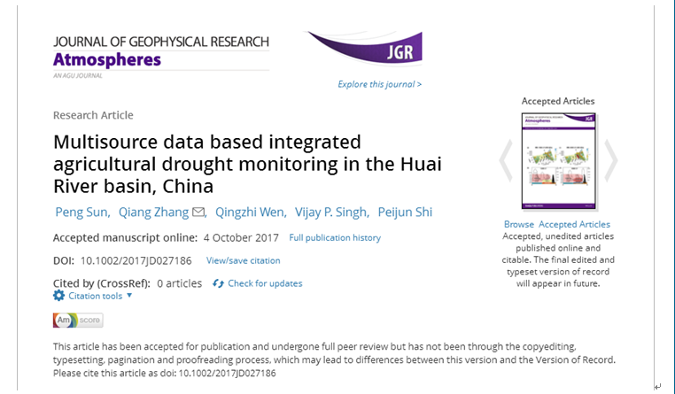 孙鹏副教授与安徽省水利厅淮河水利委员会水利科学研究院、北京师范大学减灾与应急管理学院等合作开展的基于多源数据的淮河流域干旱监测模型构建及应用研究,取得重要研究进展,其最新研究成果已在地学领域美国地球物理学会(AGU)主办的国际顶级学术期刊《Journal of Geophysical Research:Atmospheres》上全文发表,影响因子3.454(TOP期刊)。该研究得到国家自然科学基金项目(41601023,51409002)、国家杰出青年科学基金项目(51425903)、安徽省教育厅高校自然科学基金(KJ2016A851)联合资助。