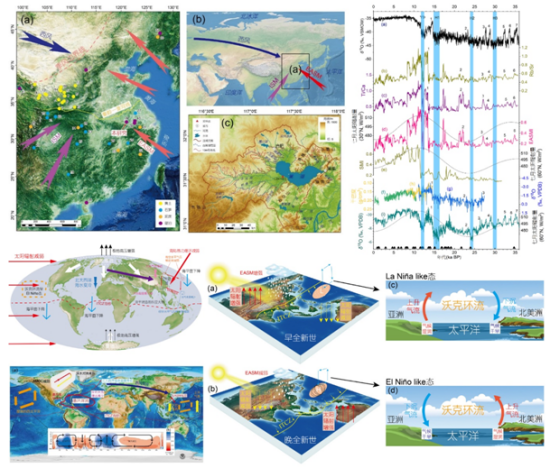 本研究基于季风核心区内的巢湖高分辨率沉积记录,利用沉积物地球化学元素、粒度和磁化率指标,重建了36 ka BP(距离1950 AD的年代)以来东亚夏季风指数(EASMI)的变化特征。结果表明,35.7~13.5 ka BP期间,EASM总体较弱;13.5~8.4 ka BP期间,夏季风强度显著增强;8.4 ka BP以来,EASMI呈现逐步下降的趋势。值得注意的是,Heinrich事件和新仙女木(YD)事件在沉积物中有明显的记录,反映此时存在显著的气候波动。这些变化特征与格陵兰冰芯δ¹⁸O记录以及印度夏季风强度具有显著的一致性,但与中国洞穴石笋记录存在差异。通过与全球水文气候记录对比发现,不同时期EASM千年尺度变化受高-低纬强迫因子的共同作用。在末次冰期,EASM主要受控于高纬度冰盖活动和西风带的影响;在末次冰消期,大西洋经向翻转环流(AMOC)通过调控低纬度印太地区气候对EASM产生重要影响;全新世以来,低纬度夏季太阳辐射成为EASM的主要驱动力,表明EASM变化与轨道尺度的太阳辐射强迫密切相关,这一特征与现代EASM具有一致性。研究结果揭示了不同气候背景下季风系统的动力响应机制存在差异。研究成果得到了国家自然科学基金项目(42271173、41771221)和安徽省“十四五”重点规划项目(2022BFAFZ01365)的支持。