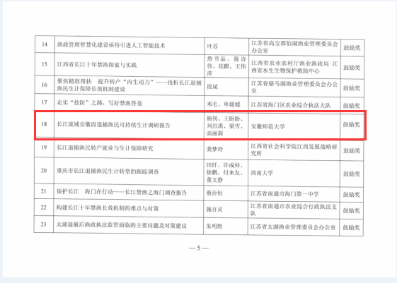 在2022年3月结束的第二届“长江十年禁渔与水生生物保护”有奖征文活动中,杨钊教授领衔的调研成果《激发内生动力,顺应转产心理,导入市场力量——长江流域安徽段禁渔经验总结》荣获二等奖、《长江流域安徽段退捕渔民可持续生计调研报告》荣获鼓励奖。2023年4月21日,农业农村部长江办、农业农村部长江水域生态保护战略研究中心、湖北省长江生态保护基金会和中关村国科现代农业产业科技创新研究院等4家单位在上海举办第二届“长江十年禁渔与水生生物保护”有奖征文获奖作者交流研讨活动,杨钊教授受邀参加并接受颁奖表彰,同时作为唯一一个以退捕渔民可持续生计为研究主题的征文作者就长江流域安徽段退捕渔民生计现状及变化、禁渔经验总结、就业转产典型案例、问题与趋势研判、可持续生计长效对策与建议等内容进行了交流汇报,调研及其成果获得了与会专家和领导的一致认可。