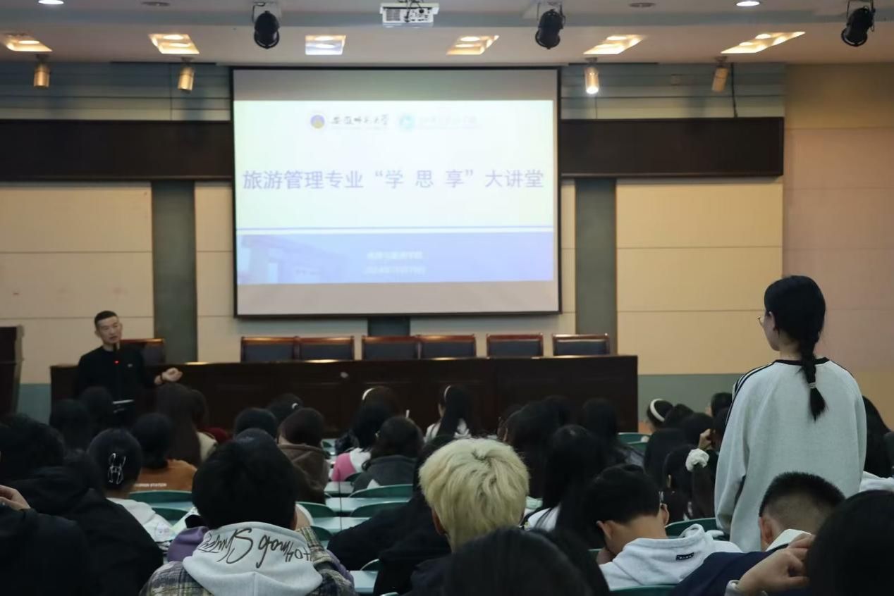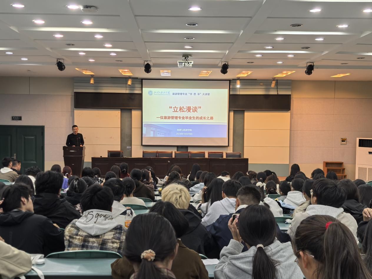 旅游管理专业在实验楼101报告厅举办“学•思•享”大讲堂第二讲暨校友面对面活动。我校2005届旅游管理专业校友、宁波松茂包装有限公司总经理朱立松,学院党委副书记付勇,2024级旅游管理专业辅导员沈涵以及2024级旅游管理专业全体新生参加活动,活动由旅游管理专业副主任张伟主持。