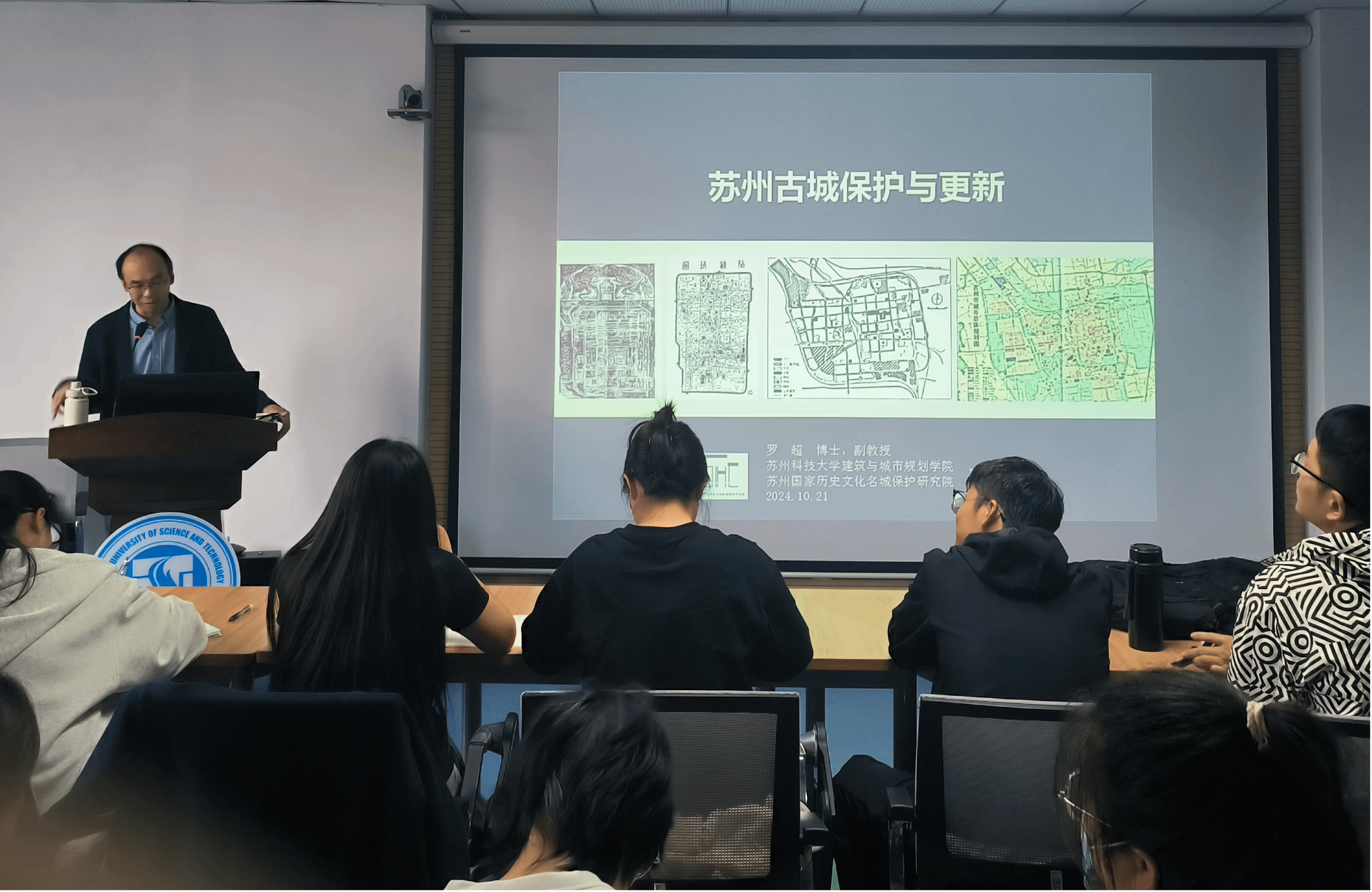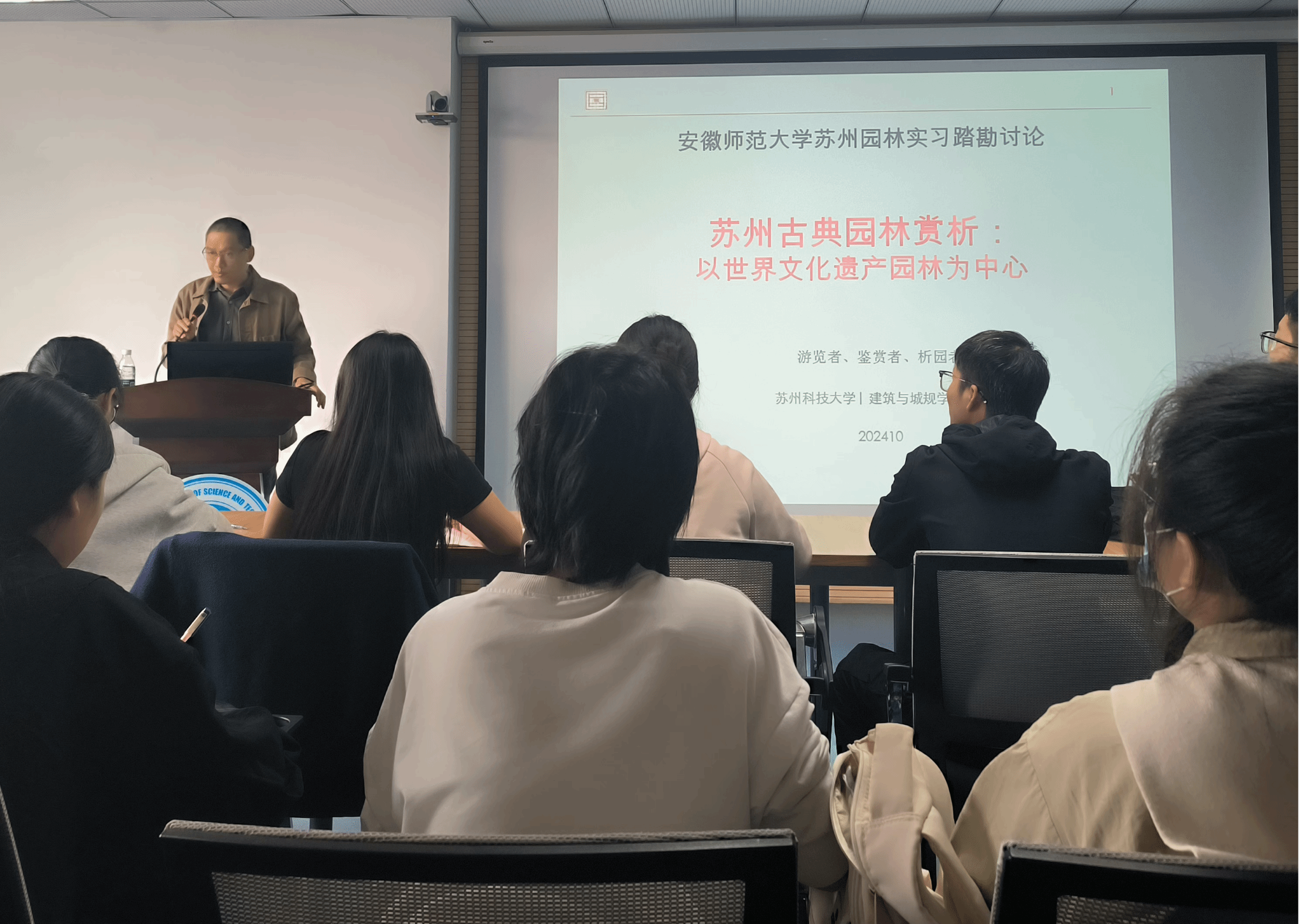 10月21日,初抵苏州,同学们在老师的带领下来到了苏州科技大学建筑与规划学院。苏州科技大学谢泓权副教授与罗超教授分别向同学们讲授了“苏州古典园林赏析”与“苏州城市总体规划解读”课程,深入赏析了苏州古典园林与传统建筑的关系,详细介绍了园林的基本设计原则与手法,细致讲解了苏州历史文化名城保护规划以及苏州市古城保护与更新相关政策。在专家的引导下,同学们对苏州城市宏观格局有了新的认知,对城市规划及古城保护等方面有了更深入的了解,为后续实地实践奠定了理论基础。