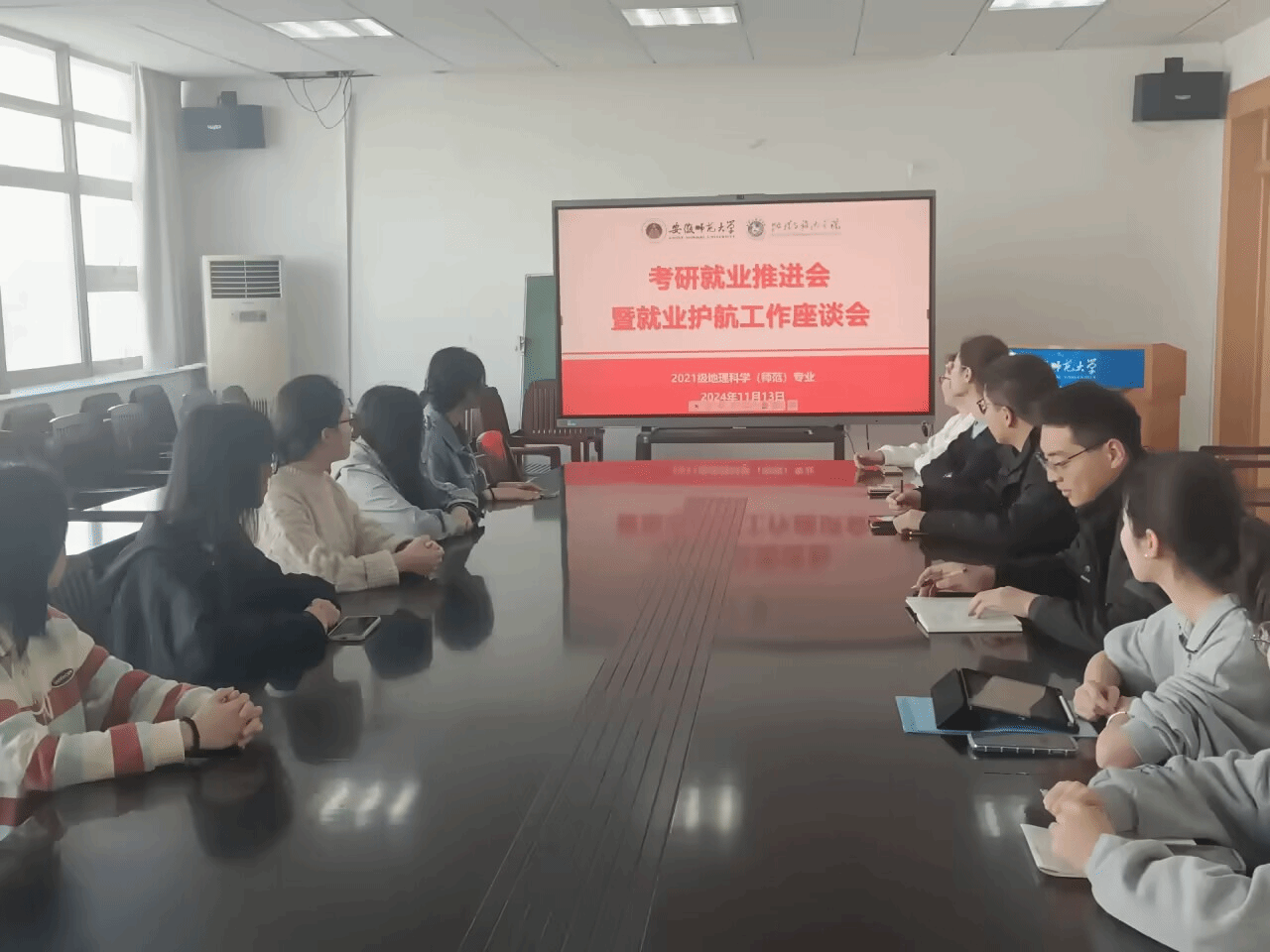 翁丹煜)为扎实推进“大学生护航行动计划”,做好毕业生就业服务和指导,11月13日,2021级地理科学(师范)专业在学院行政楼三楼会议室召开考研就业推进会暨就业护航行动工作座谈会,专业推免同学及班委代表参会,会议由辅导员韩红豆主持。