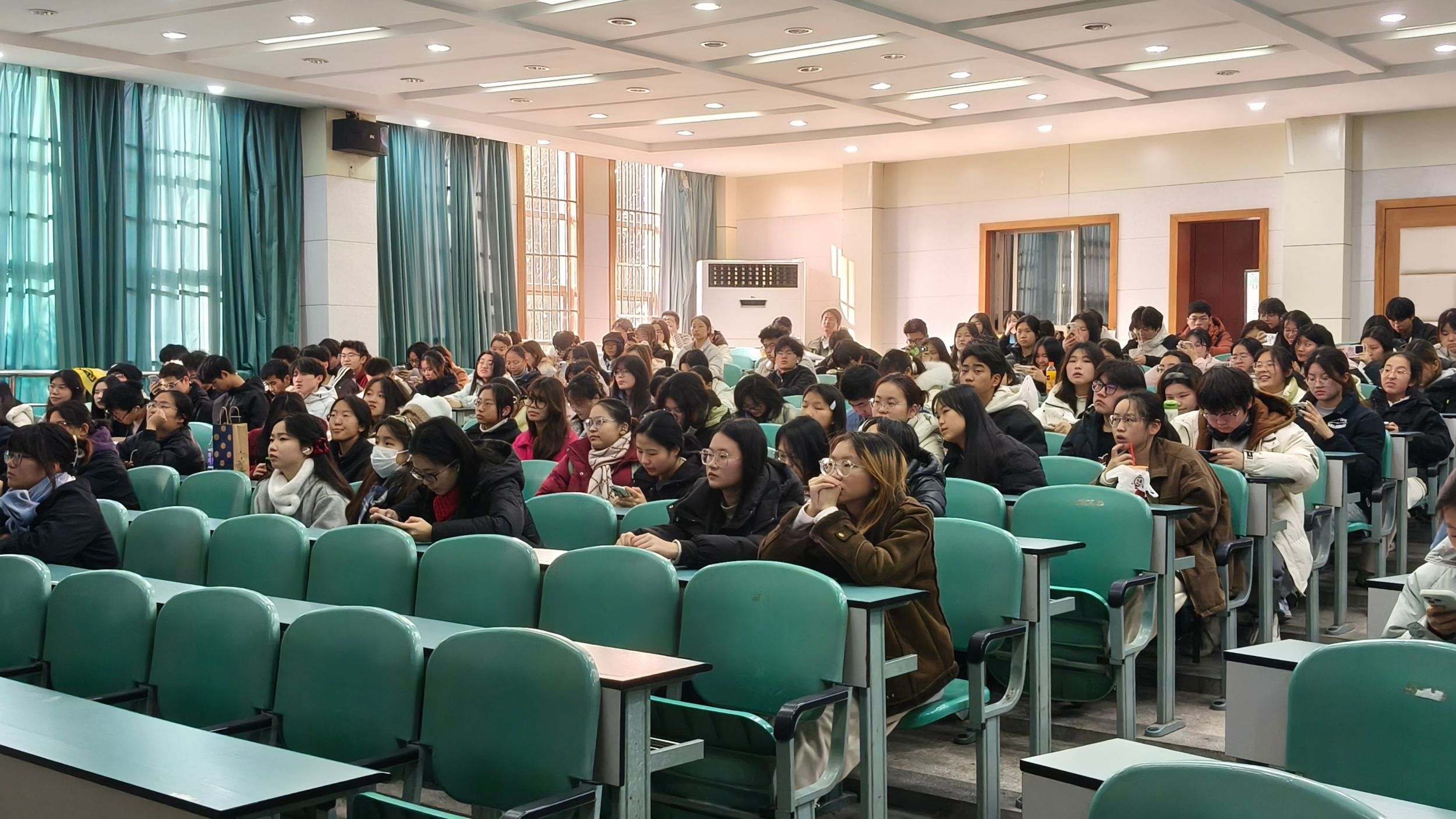 实验楼101报告厅召开假期离校安全主题班会,会议由班助章怡晨主持,各专业学生参加。