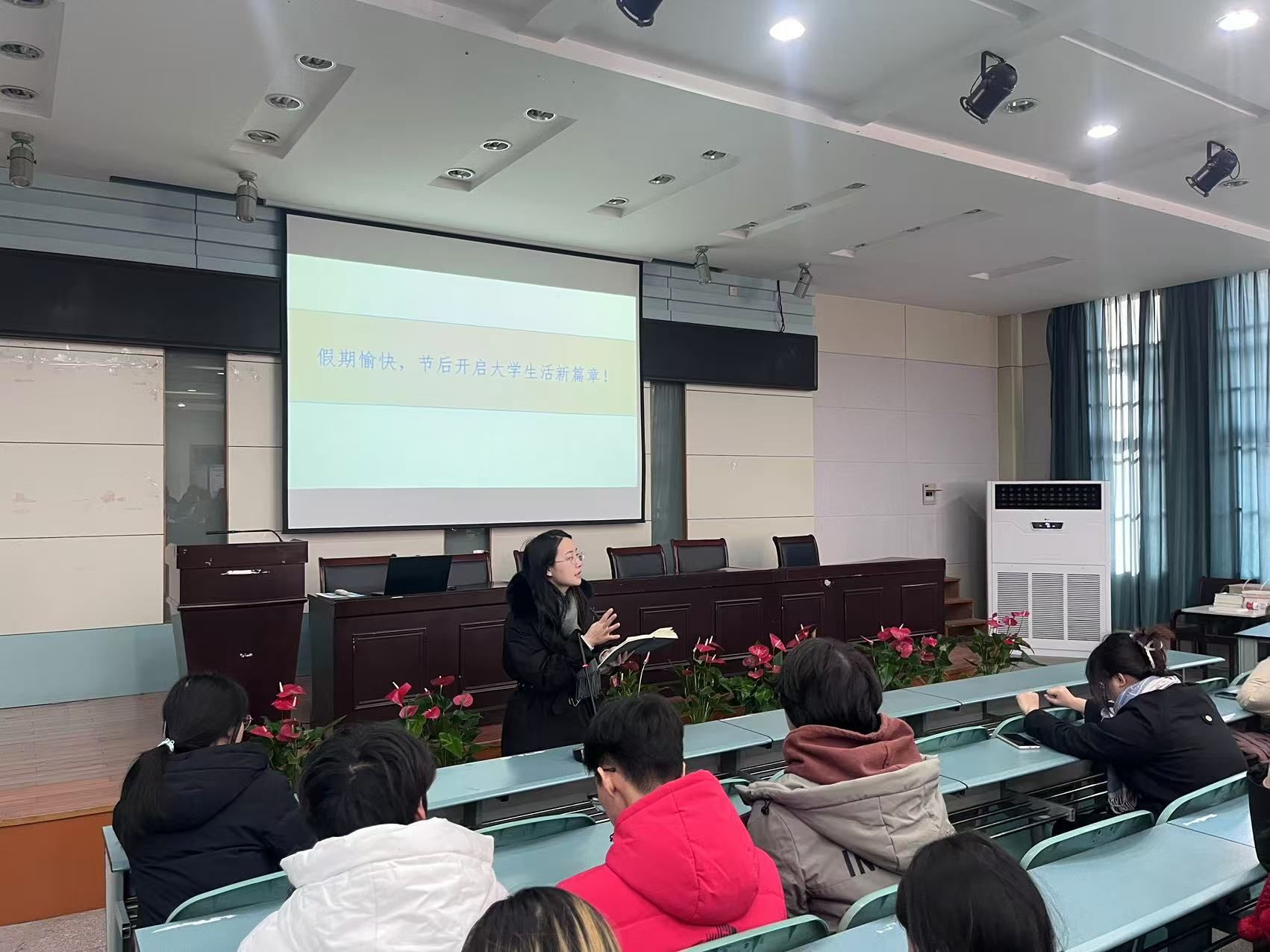 会议的最后,辅导员彭媛媛做出总结,并建议同学们可以集合本学期学习生活实际情况进行反思,合理规划假期安排,度过一个愉快且充实的假期,在节后开启大学生活新的篇章。