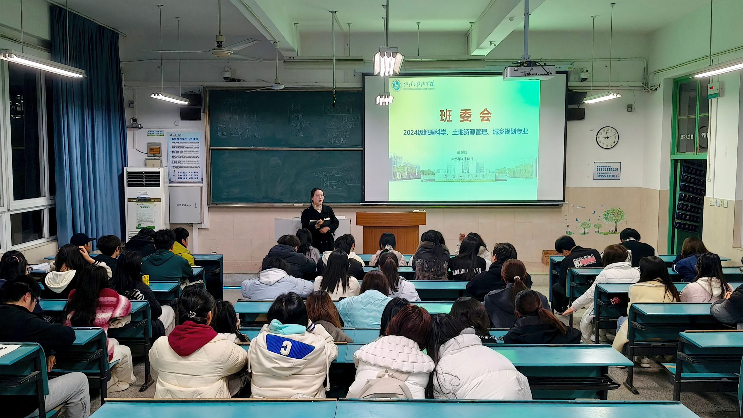 万思琪、曹文瑾、何诗雨)3月18日,为进一步加强班级管理,营造积极向上的班级氛围,2024级地理科学(师范)、土地资源管理和城乡规划专业在行知楼204104教室召开班委会。会议由辅导员彭媛媛主持,各班班委参加。