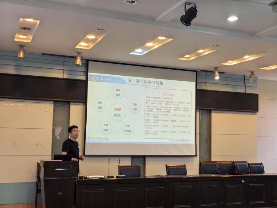 会上,各学科教师依次对实习重点任务进行了部署。土壤学徐仪红老师要求同学们在实习前通过教材预习,进一步夯实理论基础,为实习中的实际操作做好充分准备;植物学姚有如老师重点讲解了植物群落拉样方调查的标准化流程,要求各小组按时提交《植物群落调查原理与方法》实验报告,并安排各组组长于本周六上午 9:00 统一领取测量设备,确保调查工作能够按时、有序地进行;气象学孙炼老师明确了气象与水质监测的连续性要求,强调每日 8:00 至 20:00 需定时采集数据,以保证数据的完整性和准确性;地质学苗雨青老师则系统介绍了庐山地区典型地貌特征,同时详细说明了实习日志、专题报告等最终成果的提交规范,让同学们清楚了解实习成果的要求和标准。