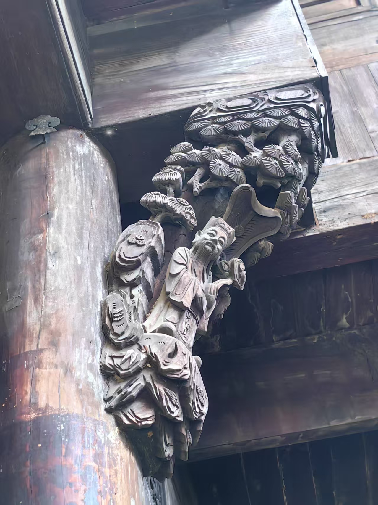 瞻淇村拥有1300余年历史、保存着102栋明清老建筑,于2018年被列入国家历史文化遗产名录。村支书汪书记向团队成员介绍了一座建于民国初期的古建筑,这座古建筑的木雕作为“徽州三雕”之一,是其最亮眼的特色。门楣、窗棂、梁柱上,一幅幅木雕作品如诗如画,其中以“八仙过海”的雕刻最为引人注目。“八仙”或腾云驾雾,或踏浪而行,神情姿态各异,动作栩栩如生,其精湛绝伦的木雕工艺令人叹为观止,展现出深厚的徽州文化底蕴。