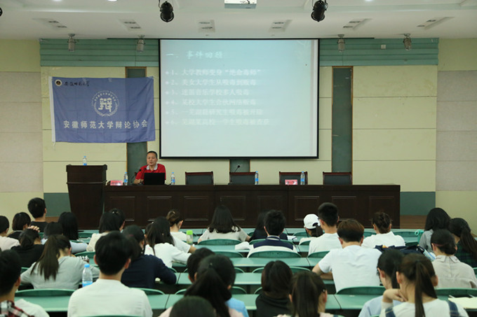 辩论者协会邀请了芜湖市禁毒委员会办公室副调研员何松新和科员俞飞在国旅学院实验楼101报告厅带来了主题为“明确毒品真危害,传播禁毒正能量”的禁毒知识普及讲座,并为大学生禁毒辩论赛的参赛队员进行指导。来自各个学院的近三百余名同学参加了此次讲座。