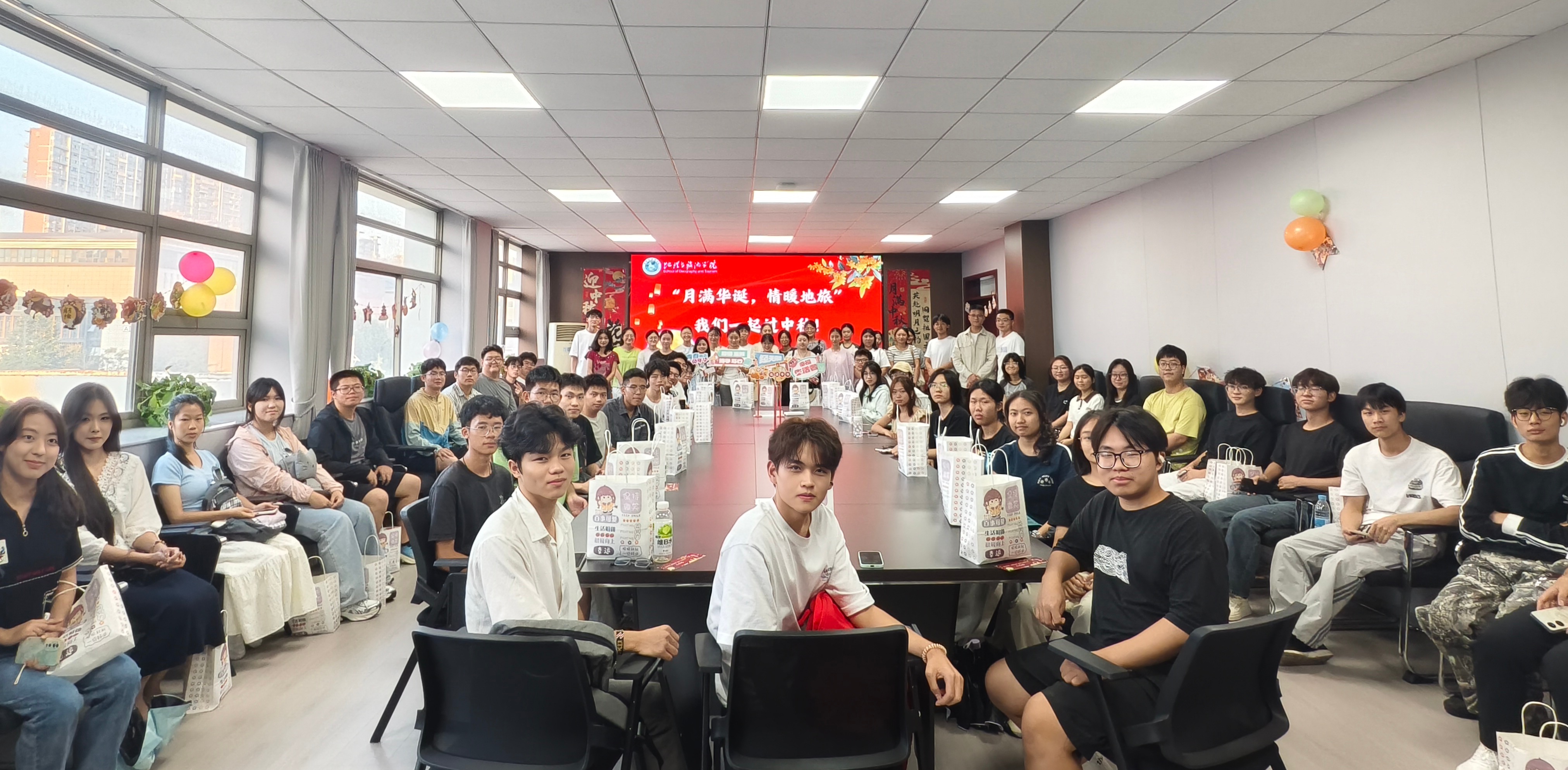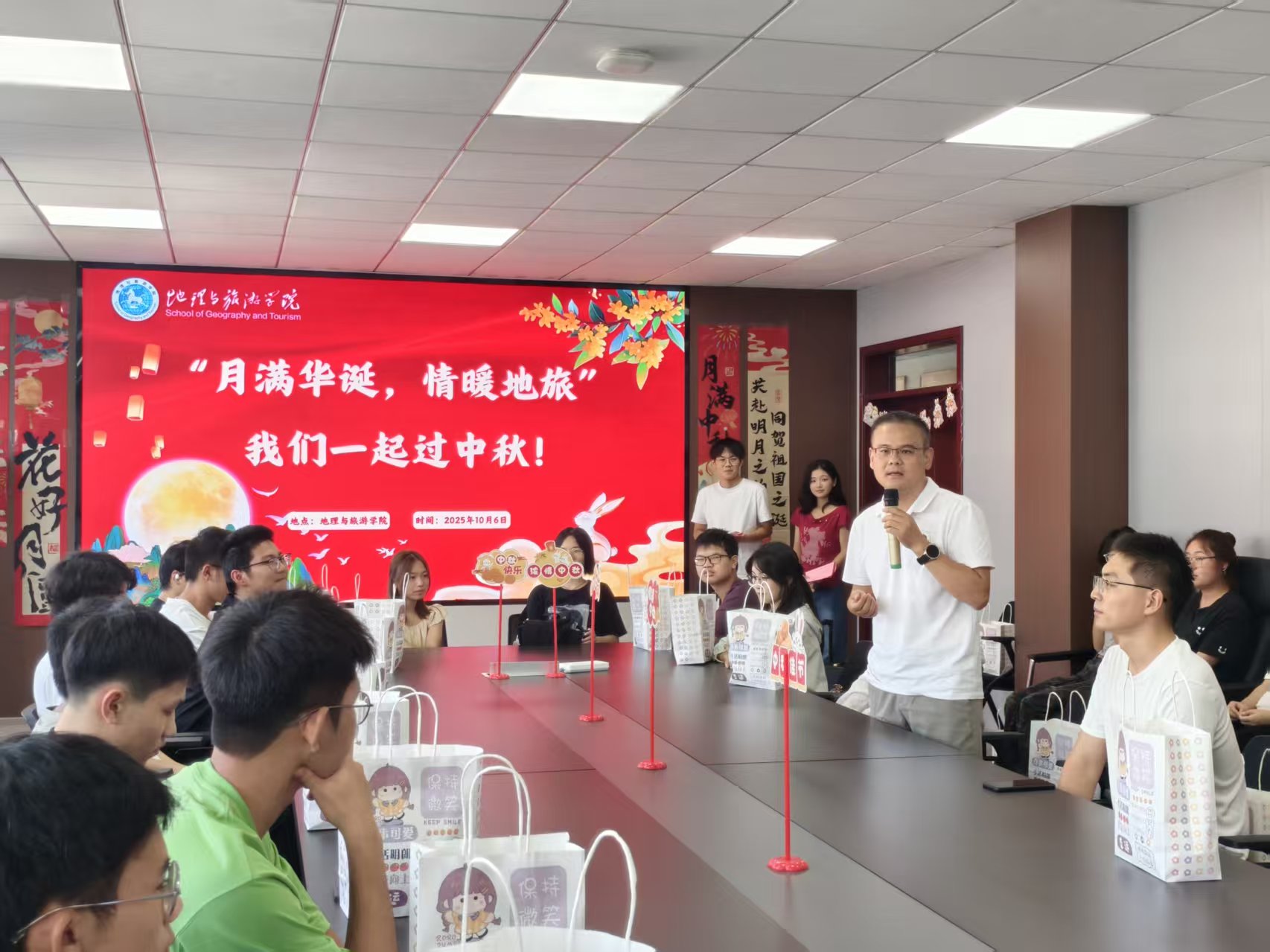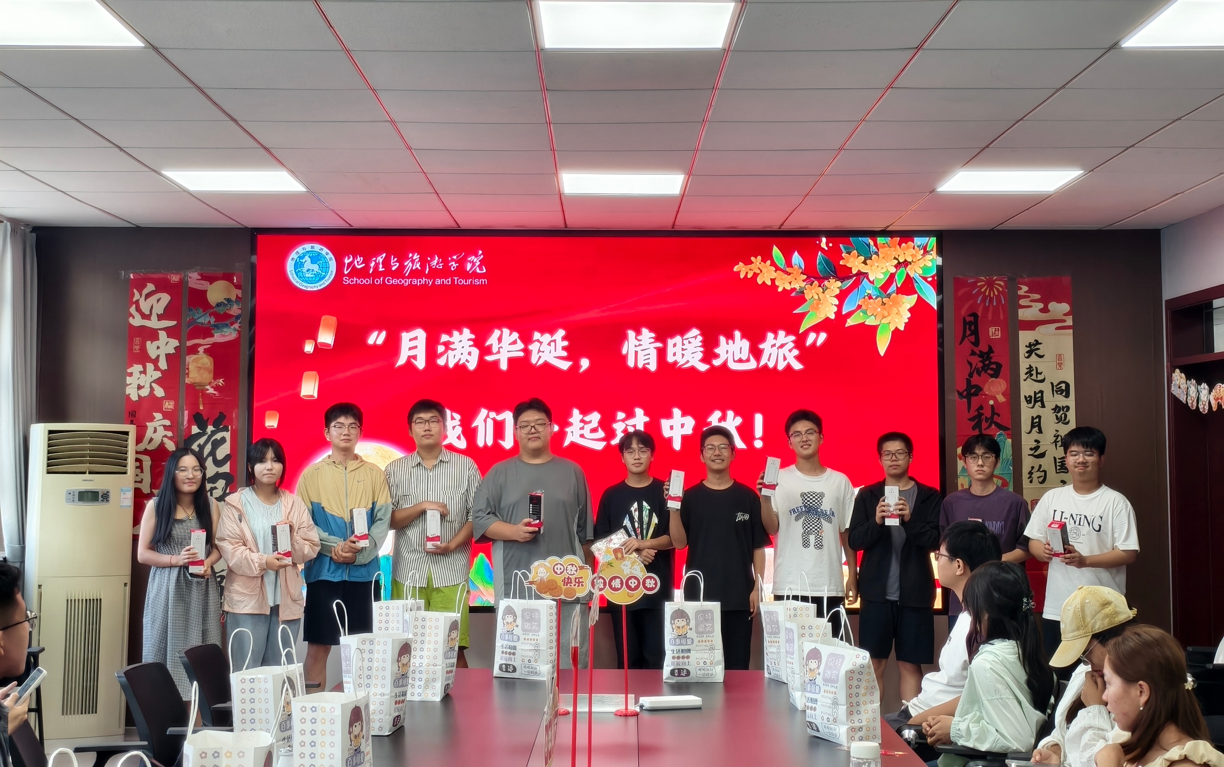 举办了“月满华诞,情暖地旅”国庆中秋联欢会,学院党委副书记付勇、团委书记韦银艳、新生辅导员韩红豆以及2025级留校本科新生参加。
