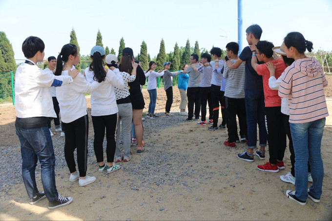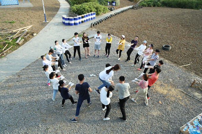 时间悄然流逝,“太空漫步”是此次活动的最后一个项目,团队所有成员带上手套围成一个圈,手上紧握一根闭合的绳子,使绳子绷直,所有人向后倾倒,依靠绳子的合力作为支撑点,避免摔倒。所进行的挑战是,团队每位成员需依次在绳子上行走一圈,过程中,一旦有一人松手或松力,就会造成其他人陷入危险,因此该项目十分考验团队协作能力和个人意志。