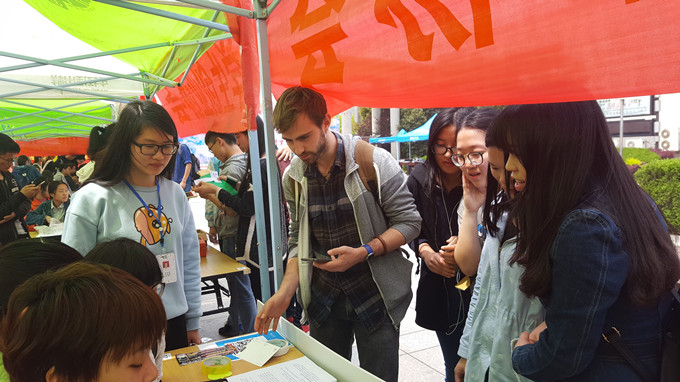 花津校区西门广场隆重举行。值此之际,爱心者协会开展爱心义卖系列活动,弘扬志愿精神,展示协会风采。