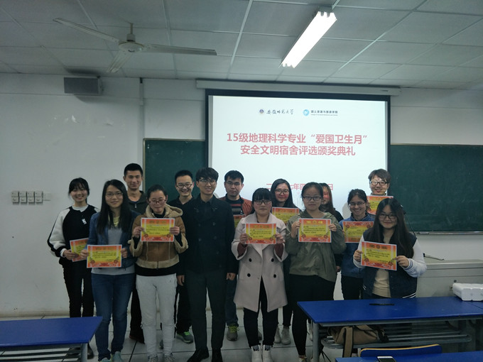 在最后的评比总结阶段,张春光老师先是为班级学生举行了春季安全教育主题班会,从宿舍安全、行途安全、信息安全以及饮食安全四个方面入手,再次向学生们强调了杜绝违禁电器、严禁晚归不归、注意兼职安全以及防范校园网贷危害等内容与要求。在随后举办的“爱国卫生月”安全文明宿舍评比颁奖典礼上,张春光老师为在安全文明宿舍创建评比活动中荣获一、二、三等奖的宿舍颁发奖状和奖品,为本次爱国卫生月主题系列活动画上圆满句号。