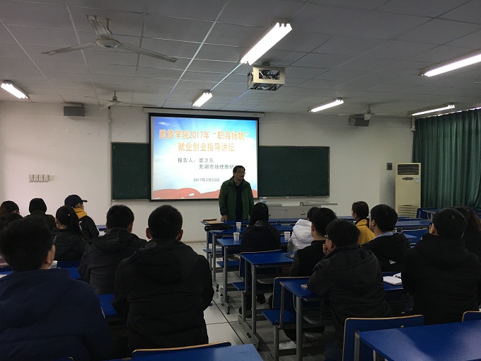 本网讯(国旅学院 陈健)3月23日,国旅学院2017年“职海扬帆”就业创业指导讲坛暨芜湖市第七中学地理教师校长实名制推荐招聘会在院实验楼202教室举行。芜湖市地理教研员裘卫东,芜湖市第十一中学地理教师马辉陵,芜湖市第七中学教师吴国春参会并作为评委,论坛由学院党委副书记乔静主持。